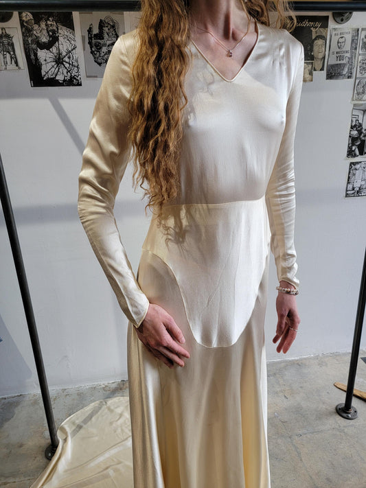 Vintage 1930s Silk Liquid Satin Wedding Gown with Train | XS | Long Sleeve |Regular price $550.00 CADRegular priceUnit price / per-
