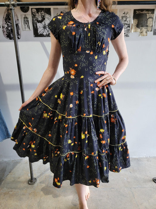 Vintage 1950s Tiered Cotton Summer Dress | Size Small | Black and Floral | Short SleeveRegular price $120.00 CADRegular priceUnit price / per-