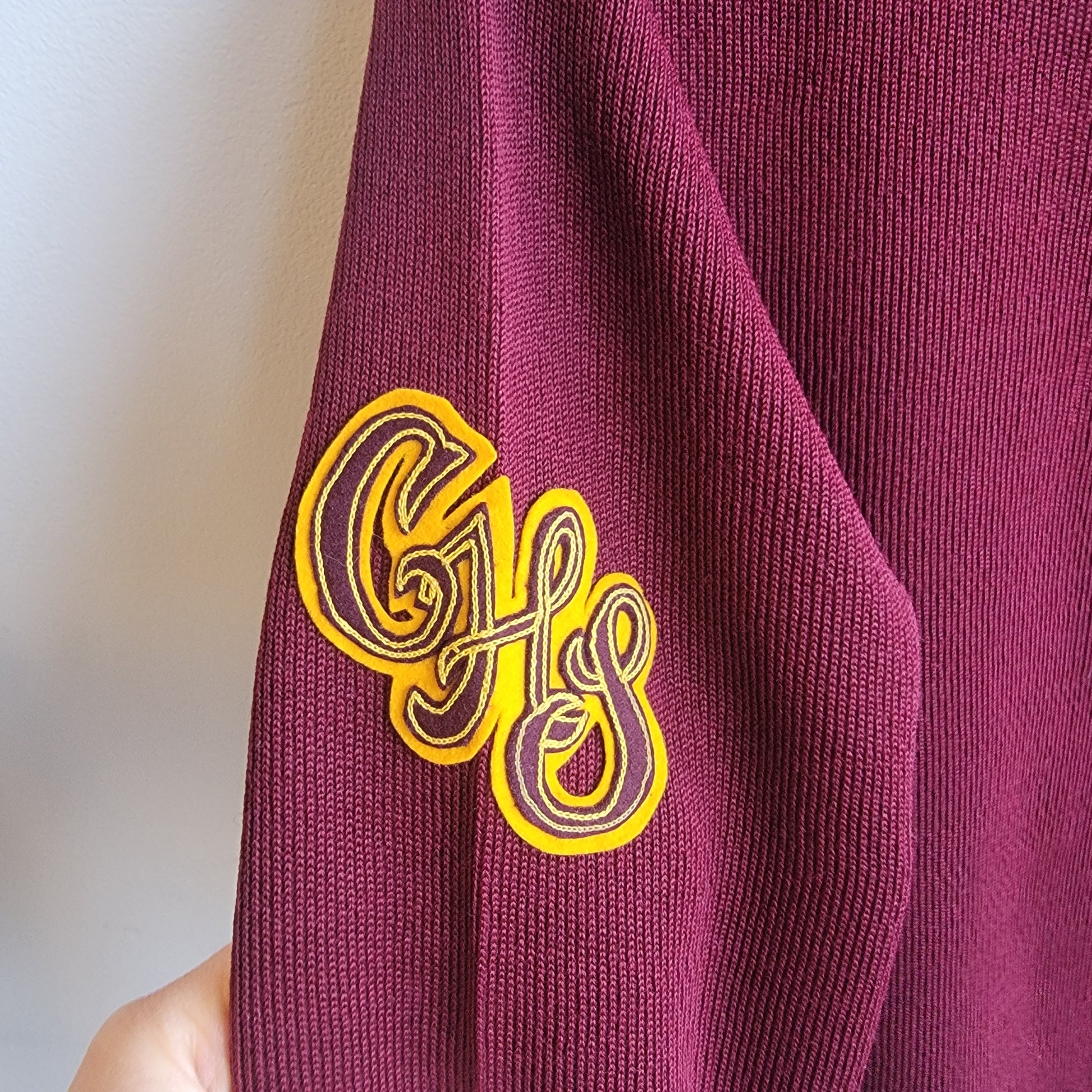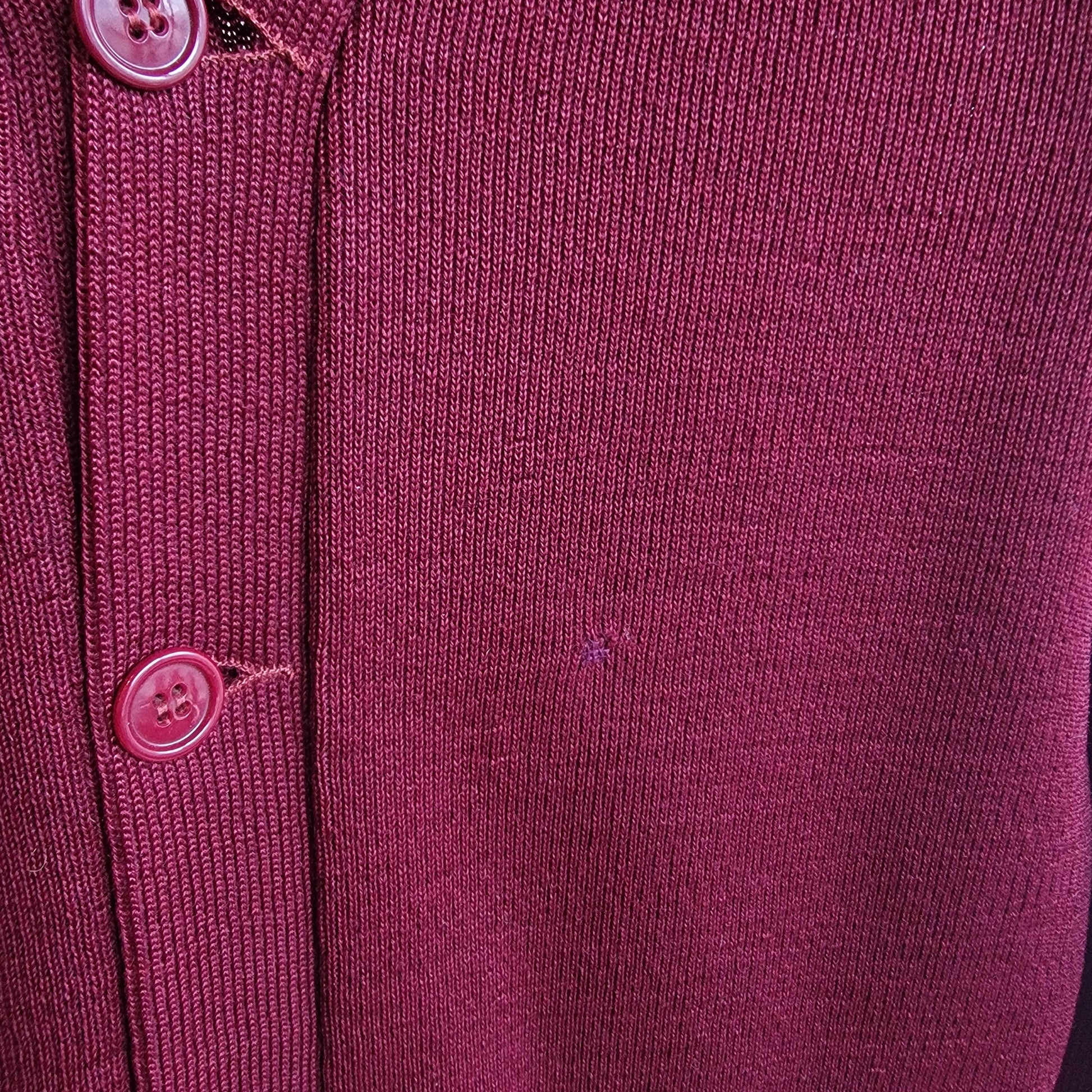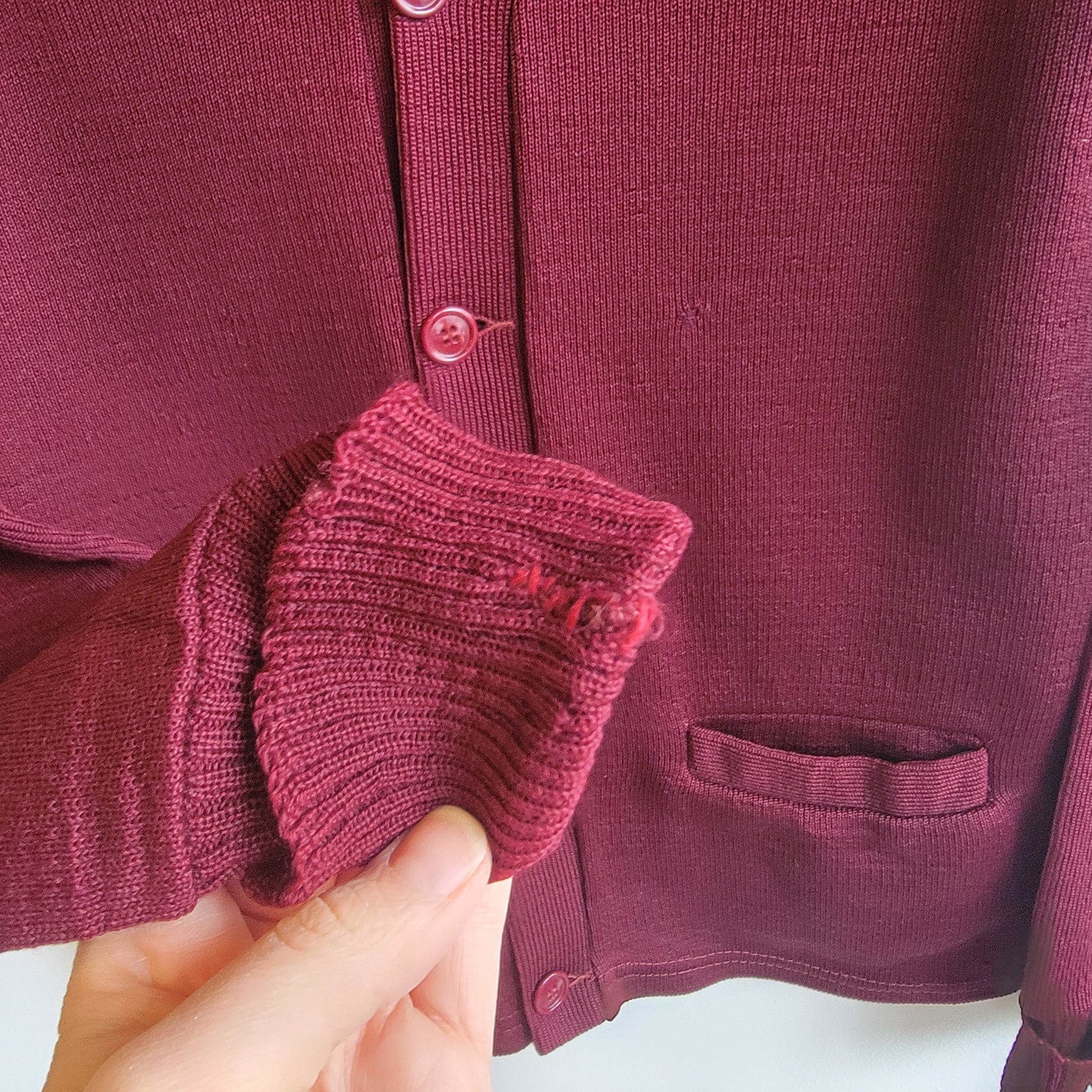A school cardigan from the 1940s. It's a lighter weight wool which feels sturdy and smooth, meant to be durable and keep it's shape. It has a lovely patch on the sleeve. There is some hand mending on the cuffs and a mend on the chest.