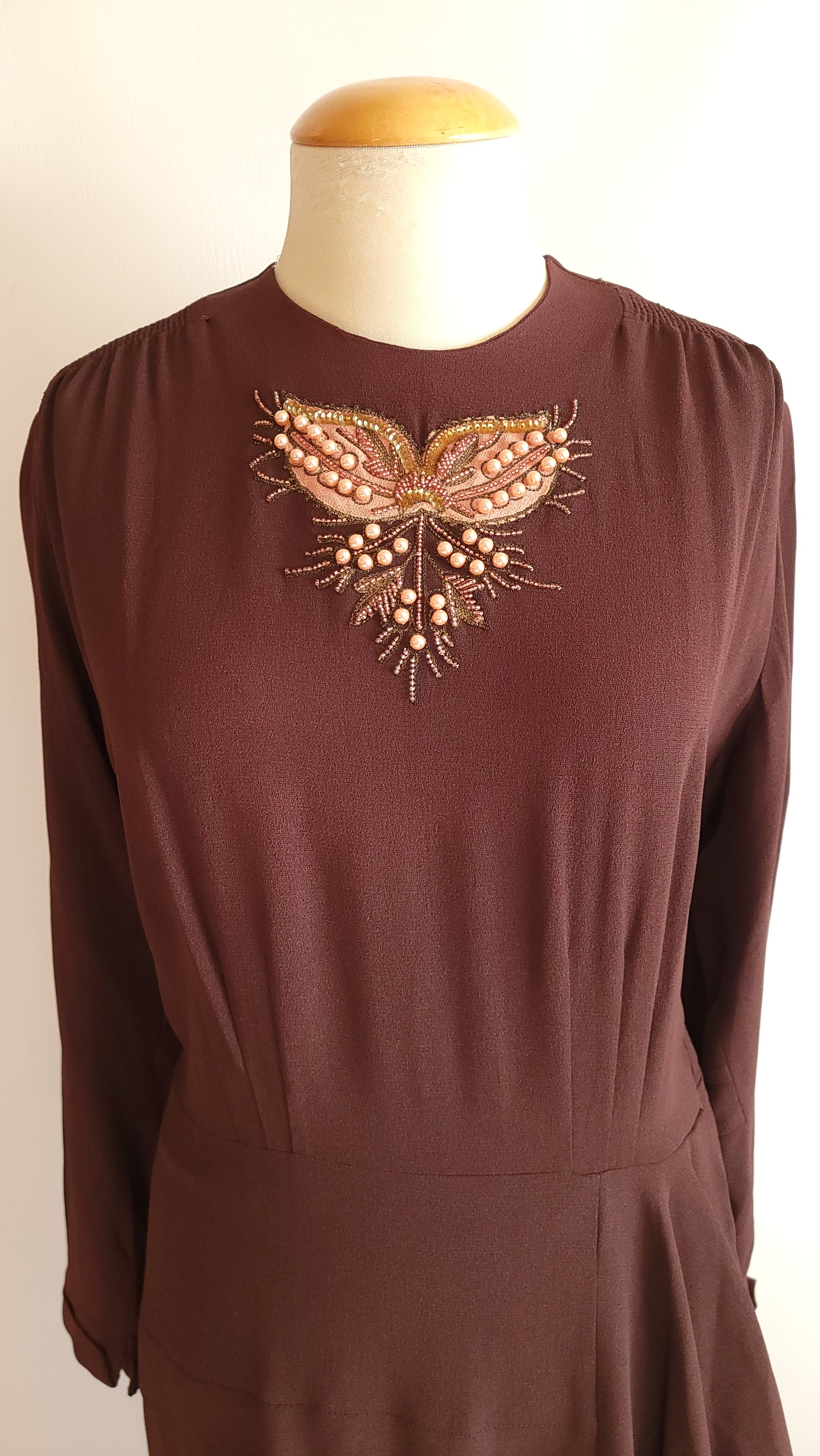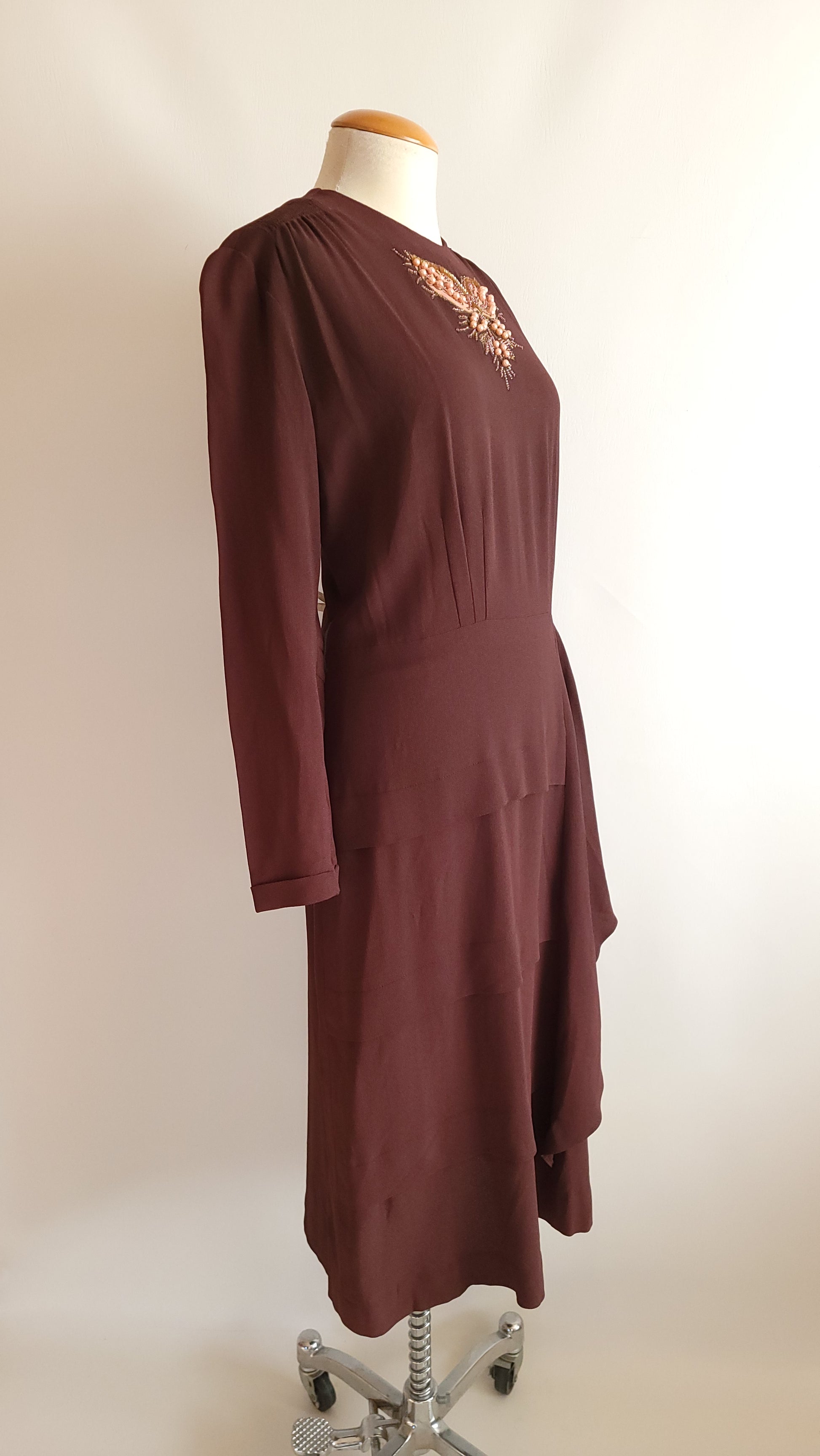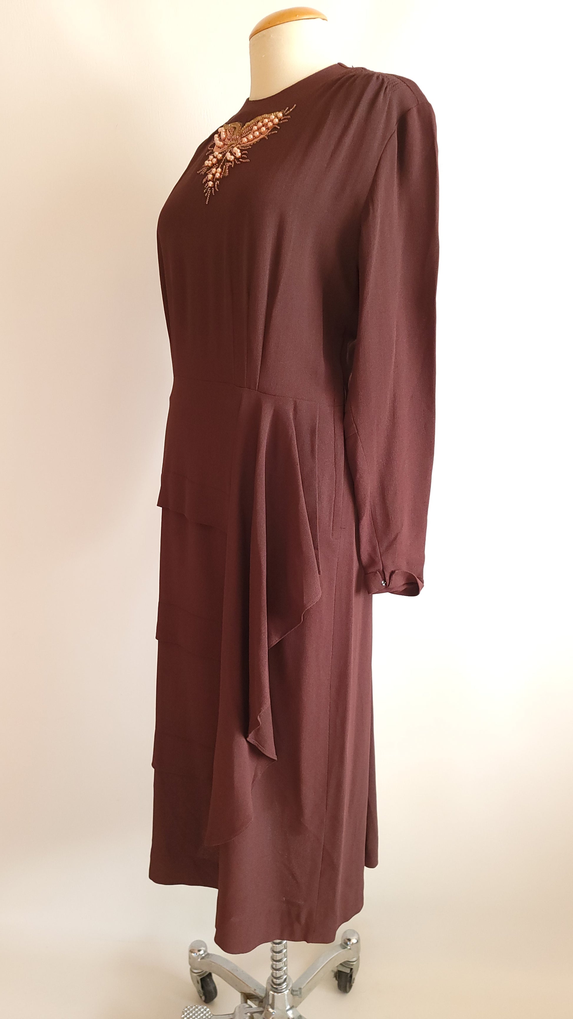 A lovely vintage dress from the 1940s. It is made from a rayon crepe fabric and adorned with beads, sequins and gold thread in the form of a leaf. Zipper closure on the side, hook at the collar. The dress is in excellent condition.