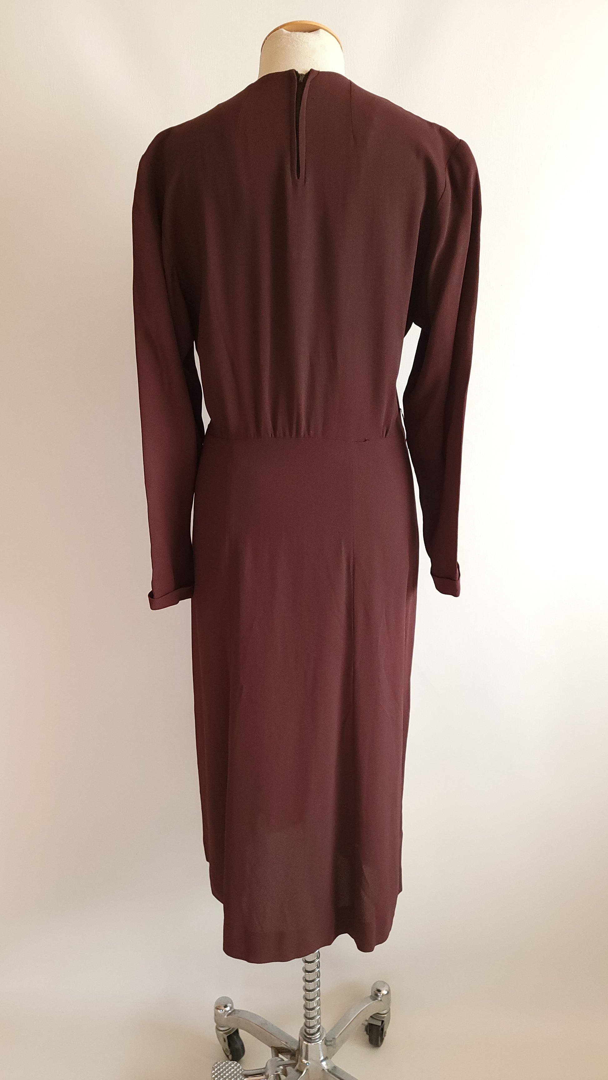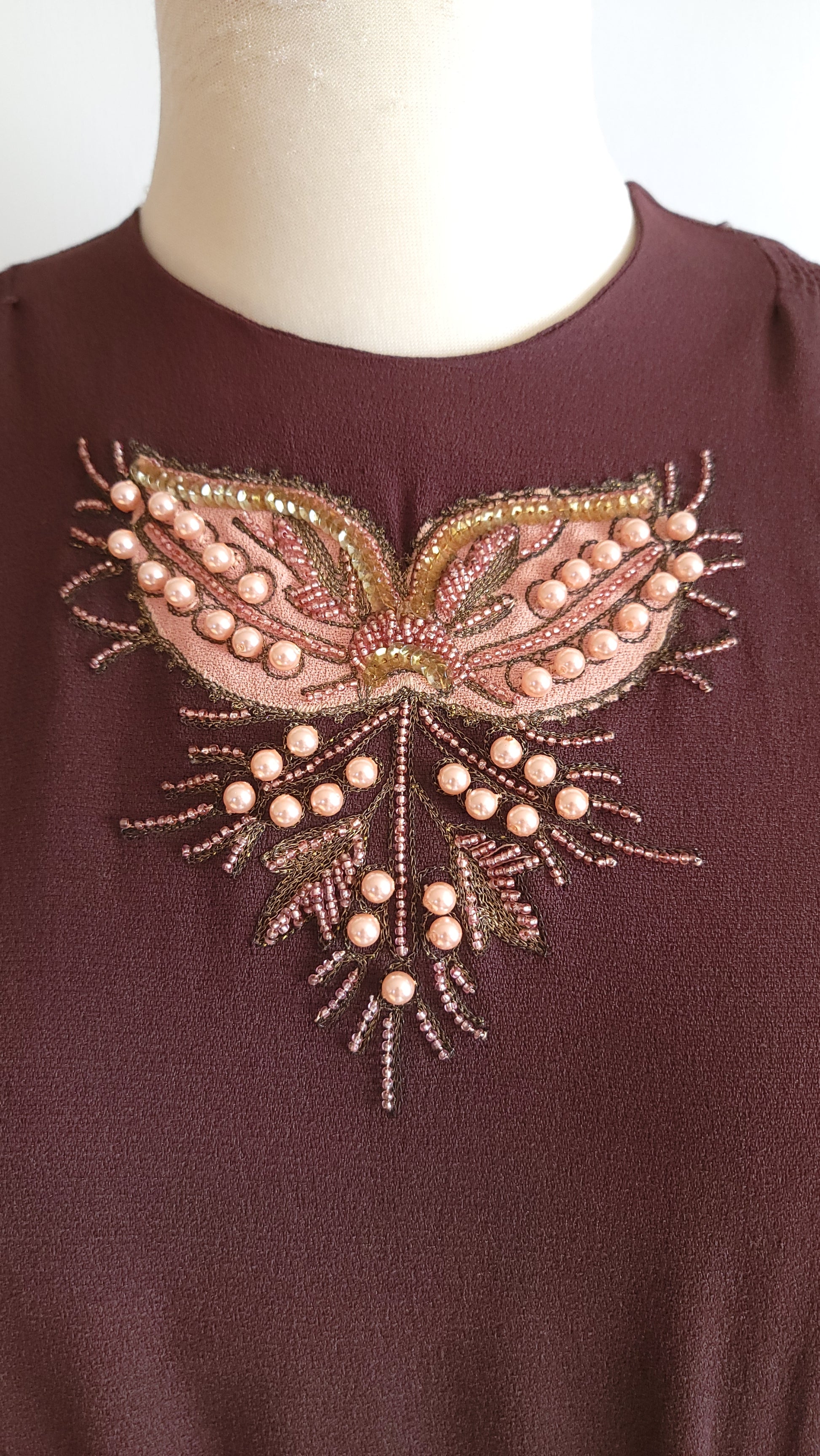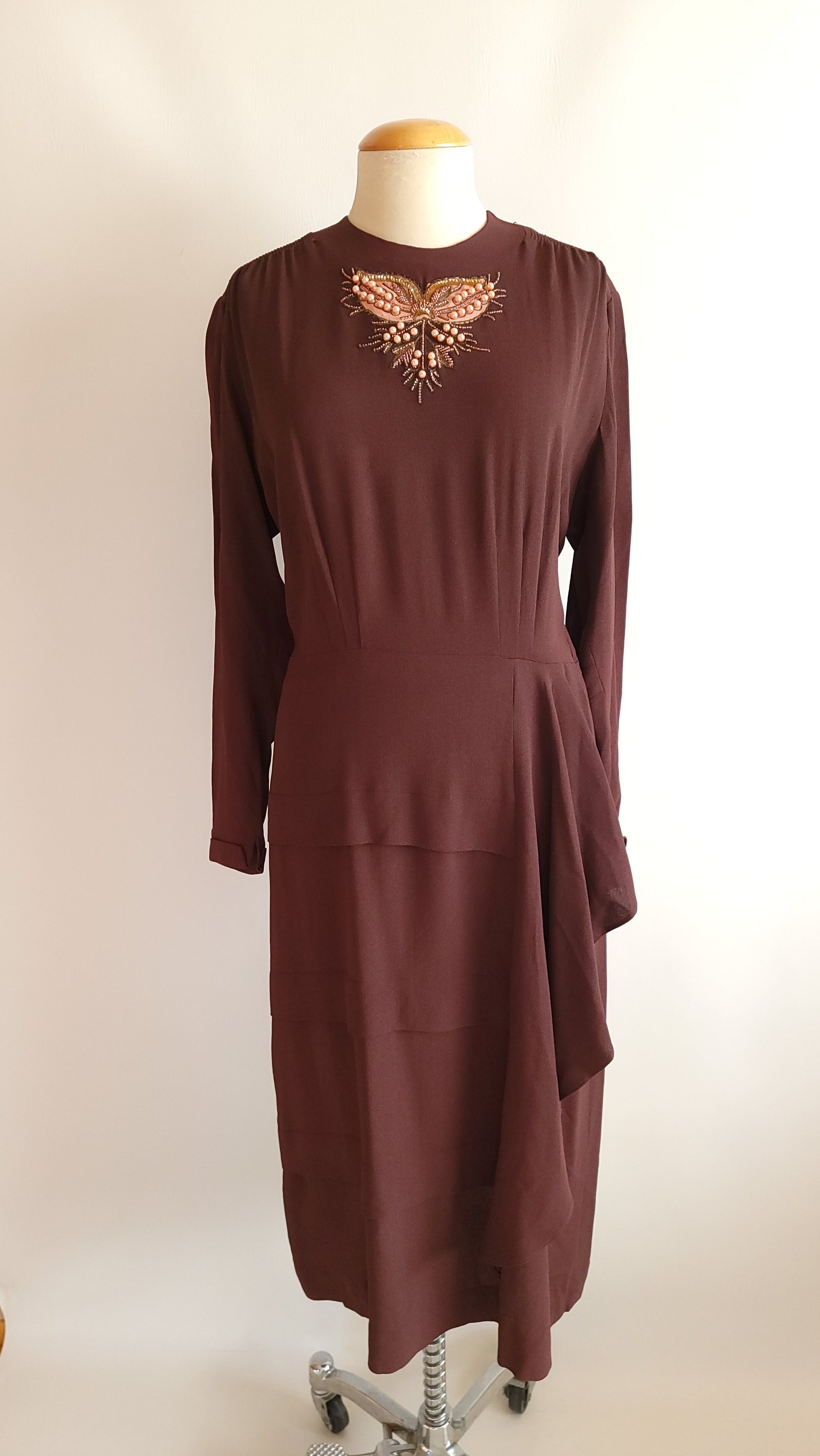 A lovely vintage dress from the 1940s. It is made from a rayon crepe fabric and adorned with beads, sequins and gold thread in the form of a leaf. Zipper closure on the side, hook at the collar. The dress is in excellent condition.