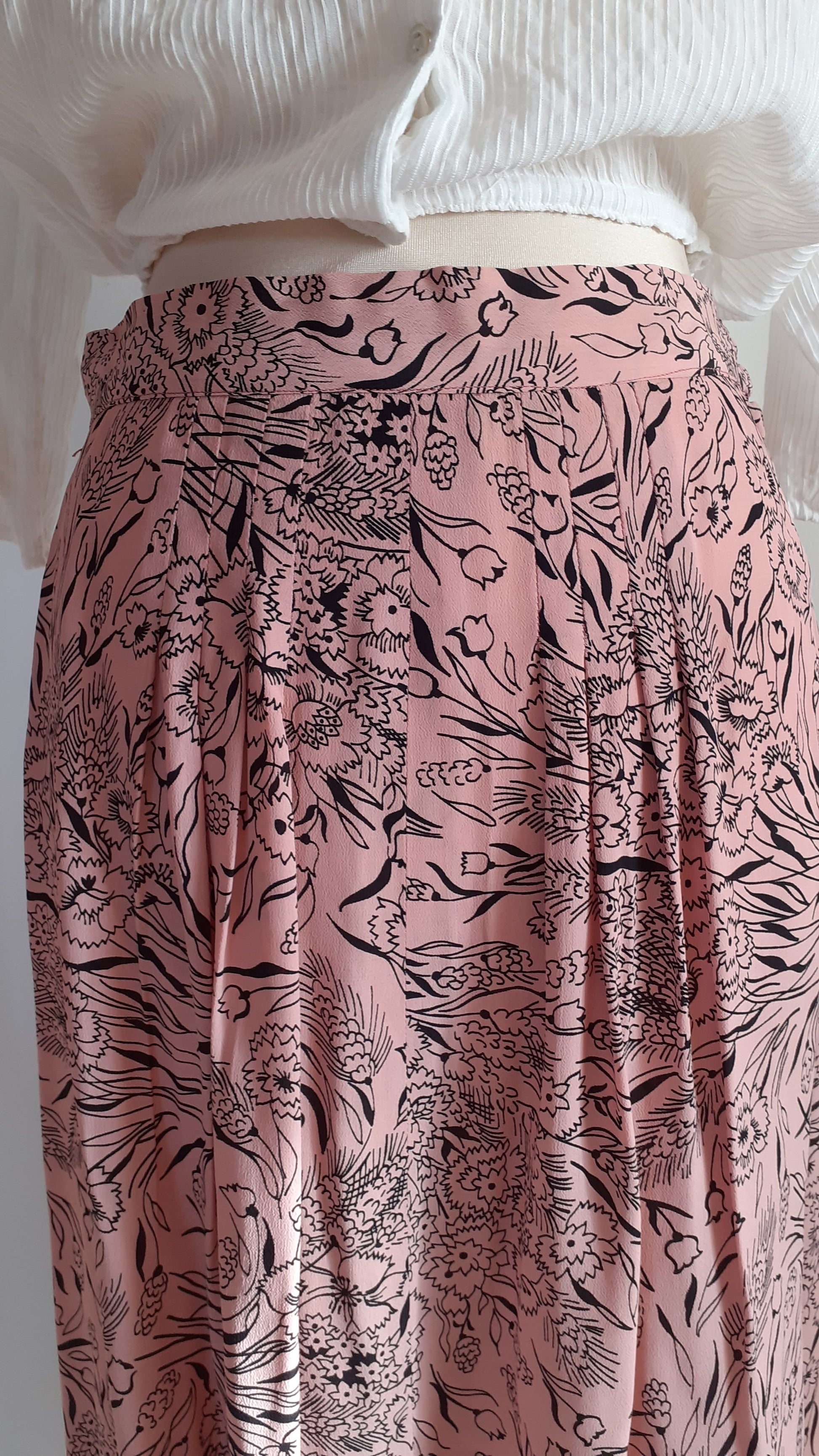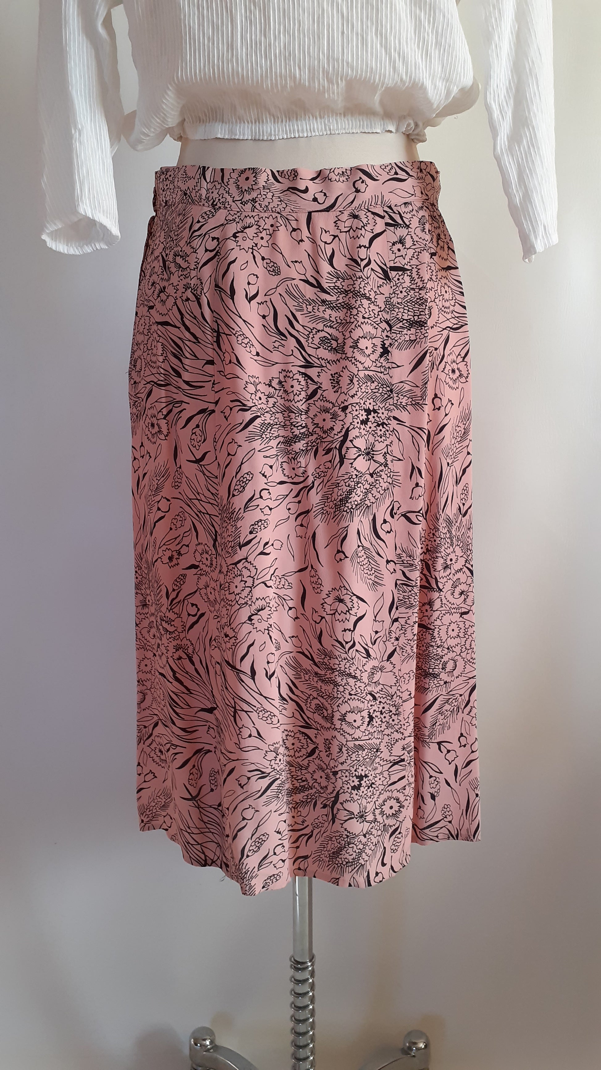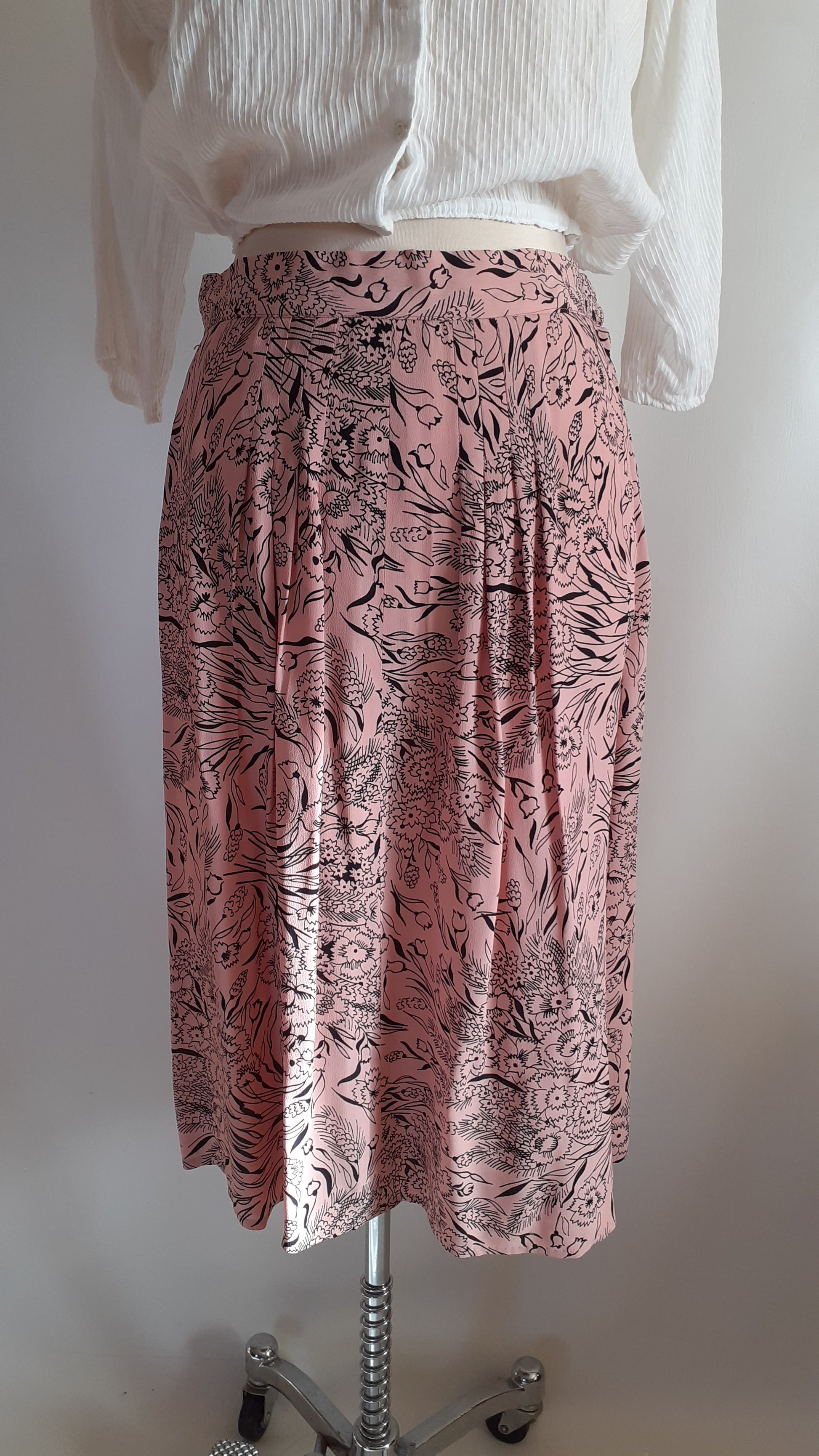 A pretty rayon skirt from the 1940s. It has a spring floral print with pansies and tulips. There is a 'crown' zipper on the side and a hook at the waist. There are no labels but it is very well made and hemmed by hand. There are pleats in the front. The skirt is in excellent condition, there is only one flaw, 2 tiny holes close together on the side close to the waistband.