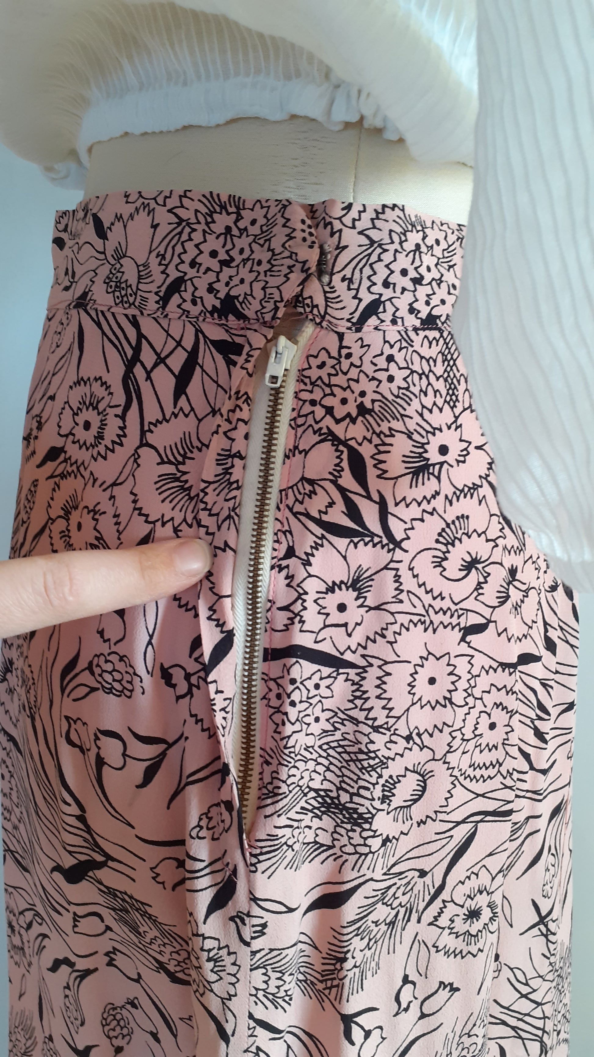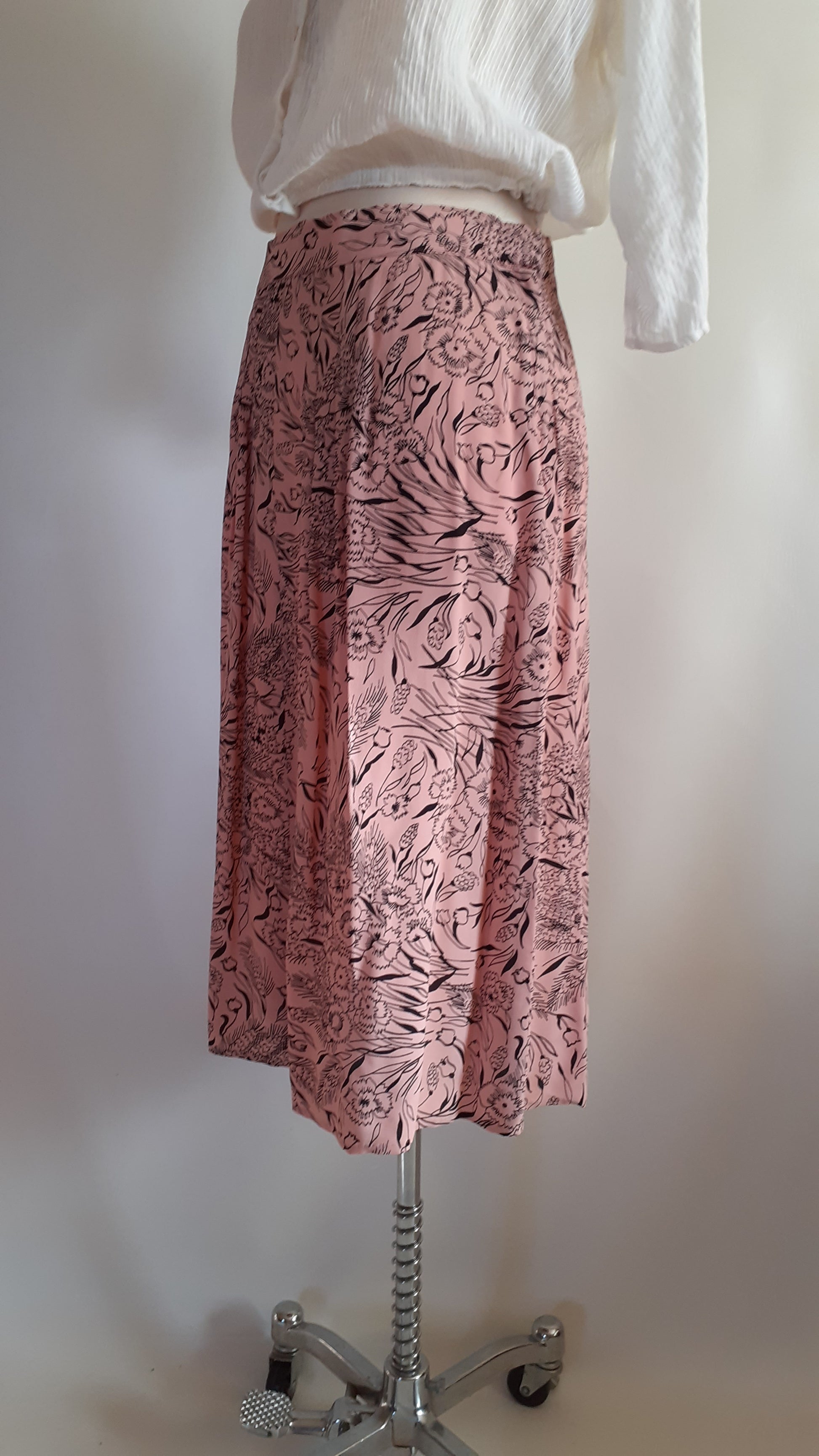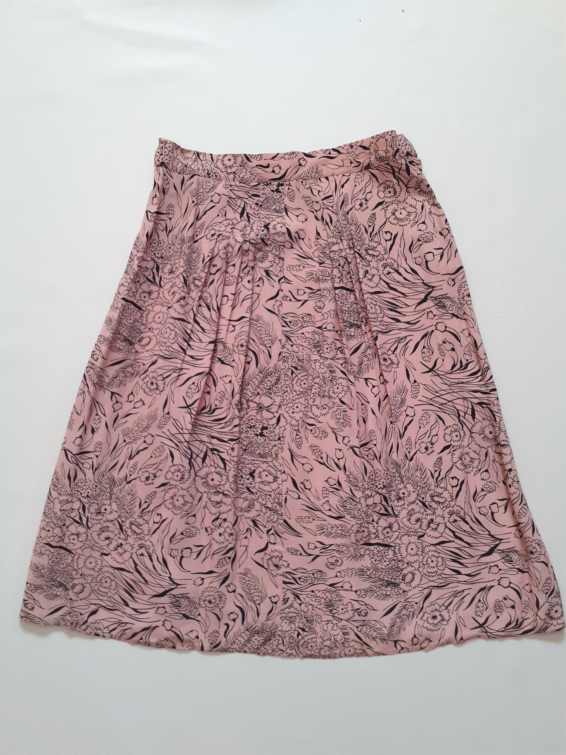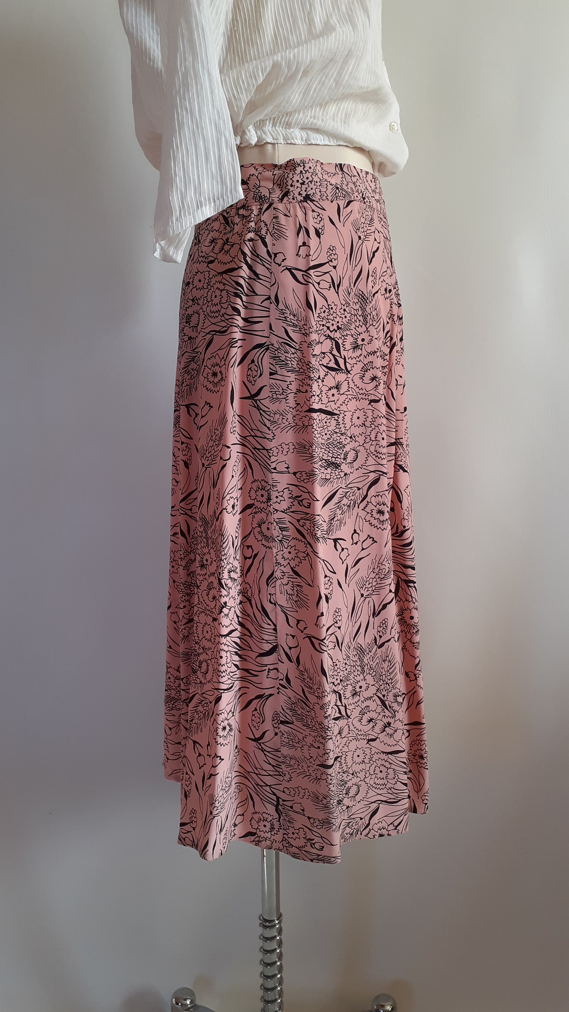 A pretty rayon skirt from the 1940s. It has a spring floral print with pansies and tulips. There is a 'crown' zipper on the side and a hook at the waist. There are no labels but it is very well made and hemmed by hand. There are pleats in the front. The skirt is in excellent condition, there is only one flaw, 2 tiny holes close together on the side close to the waistband.