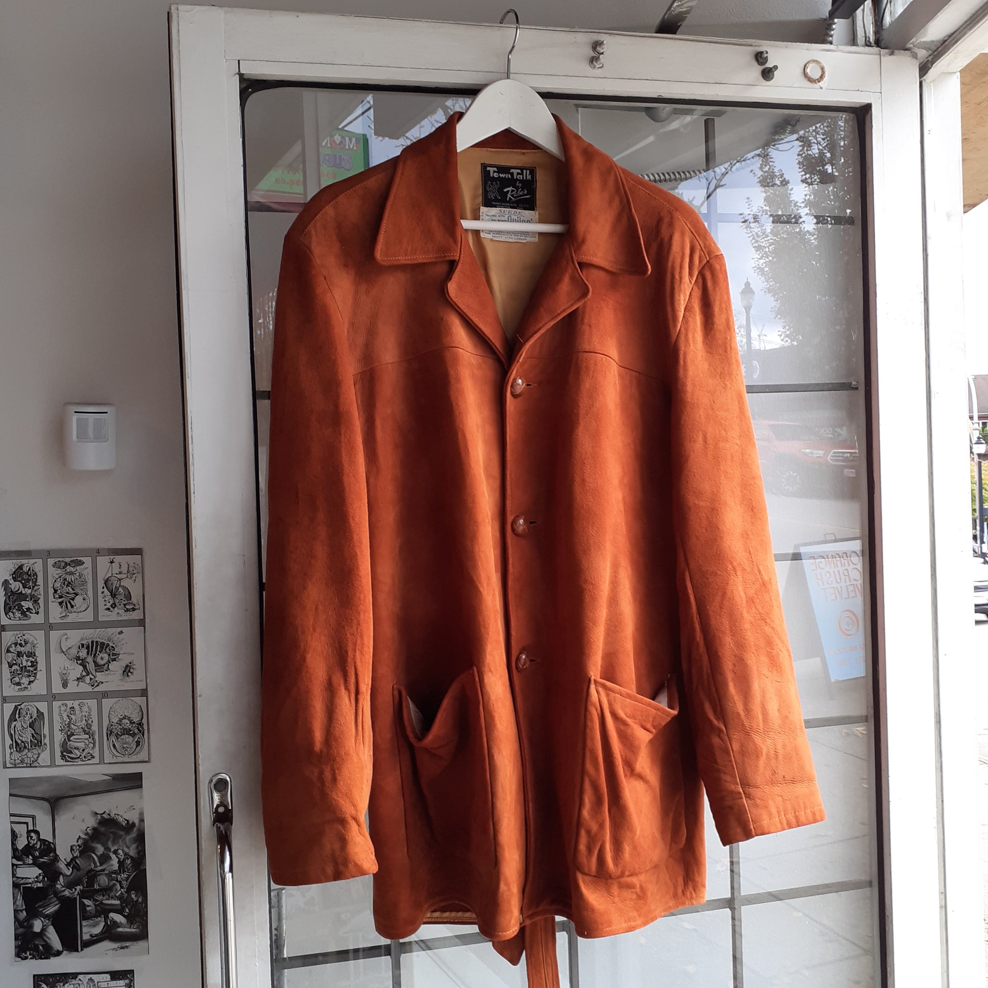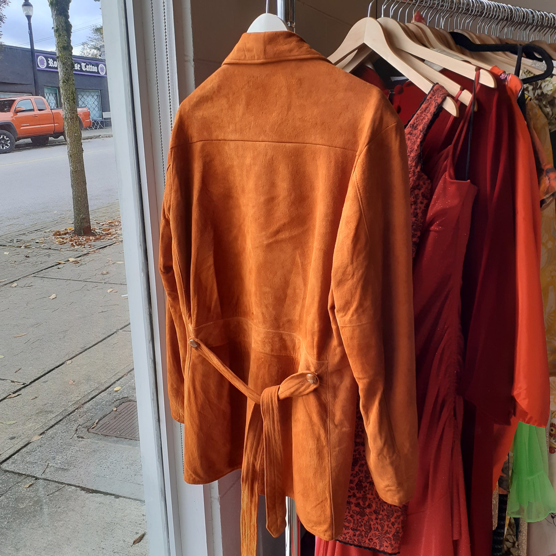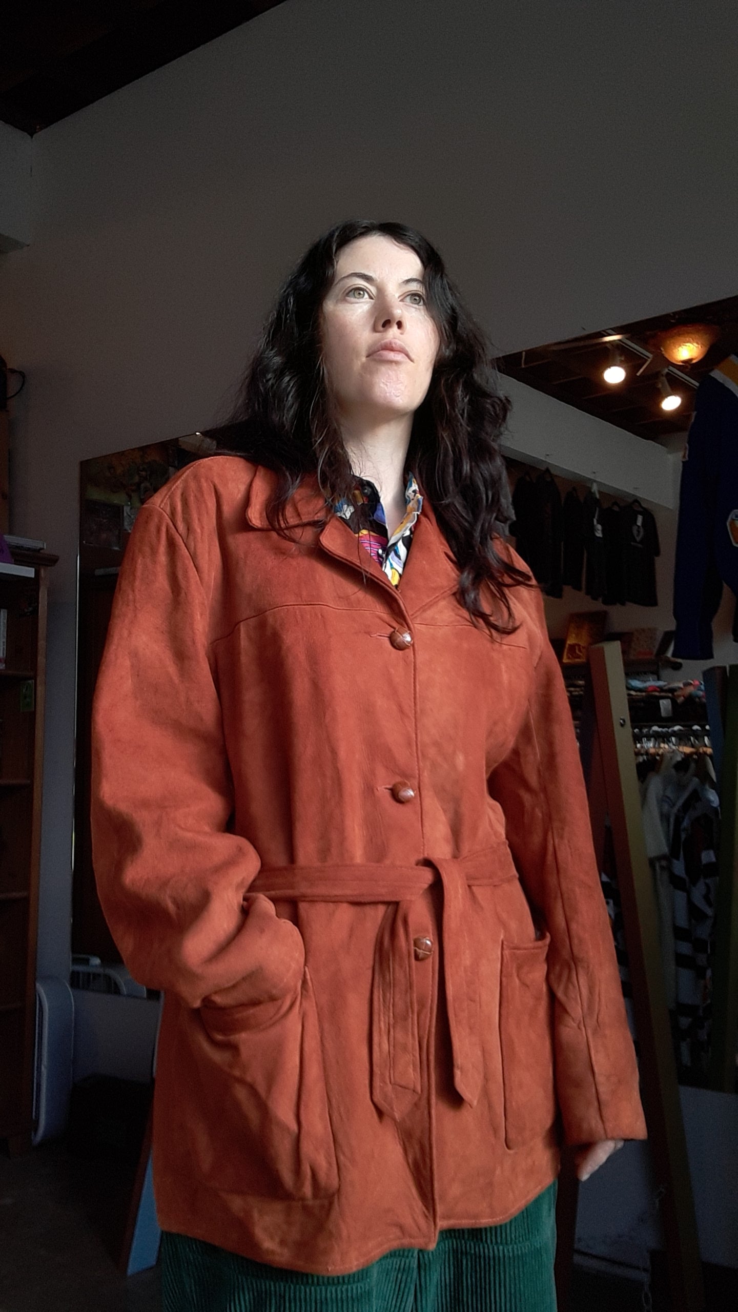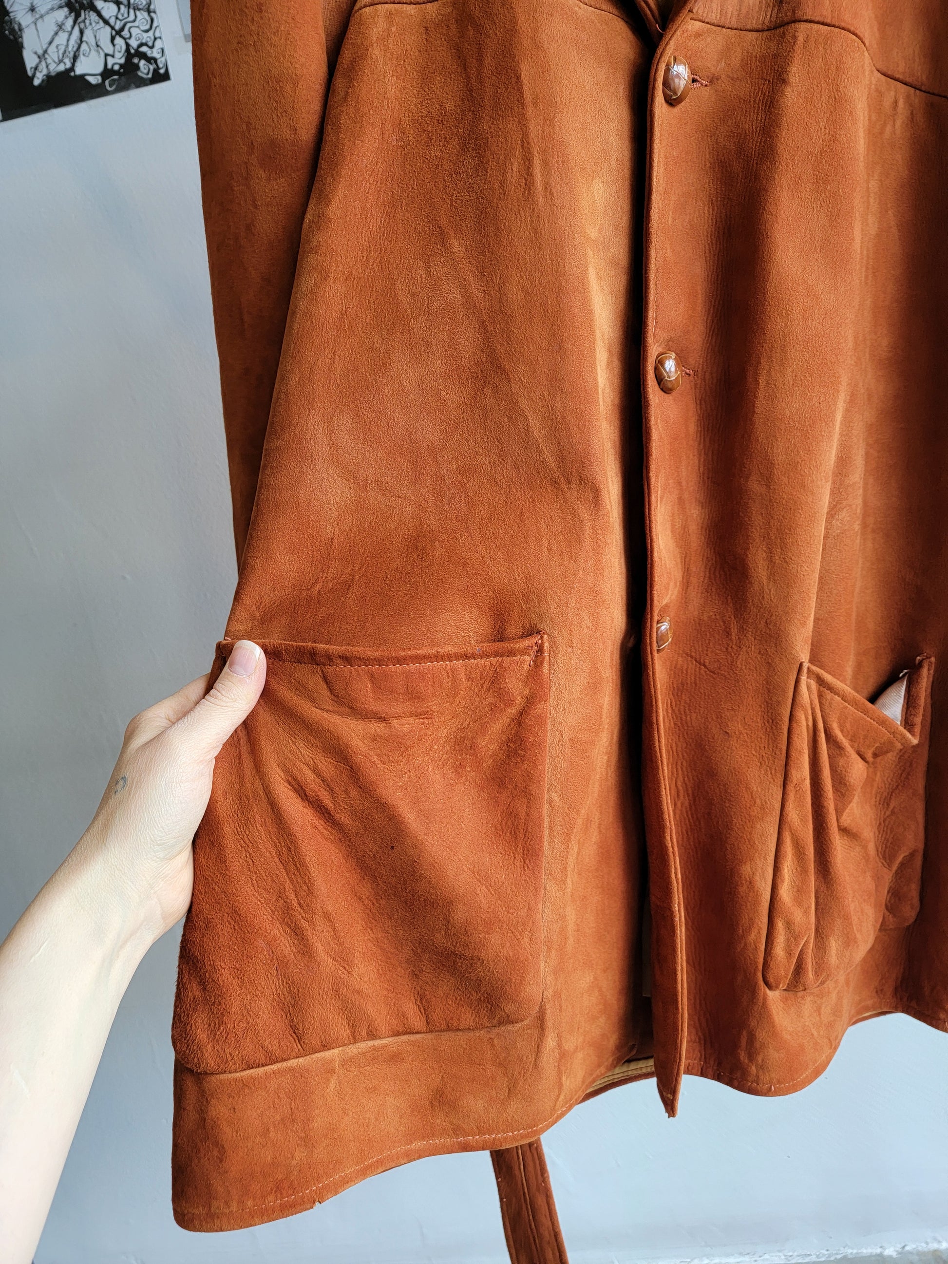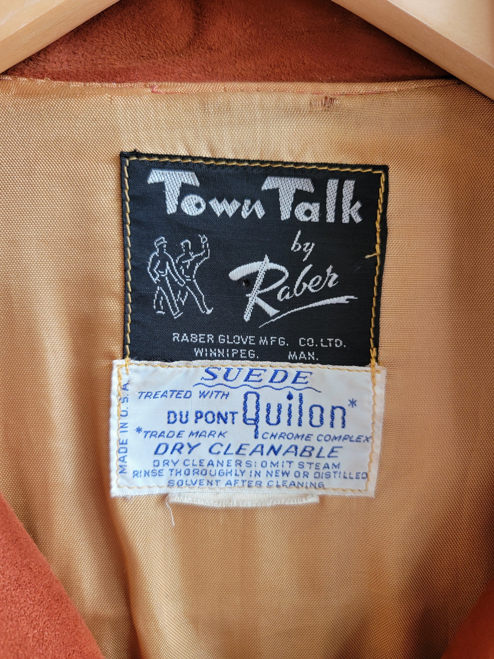 An awesome 1950s suede jacket. It is made from soft, light suede in great condition. The jacket has an optional tie waist that buttons off. It's in great condition overall but there are a few flaws to note. There is a tiny flaw on the bottom as shown. There is a minor crease where the sleeves were rolled up. There is a small rip on the back beside where the button is sewn on.