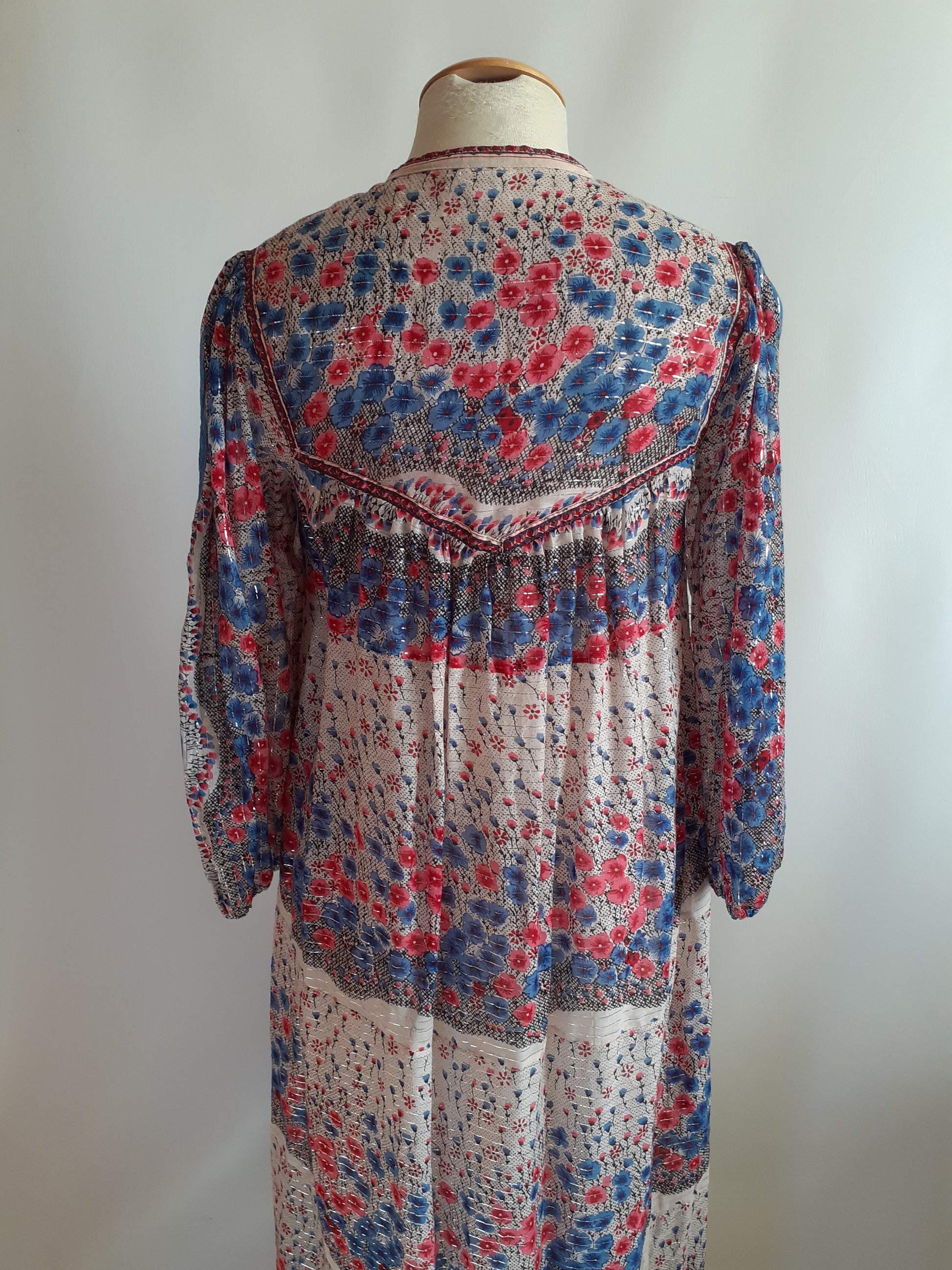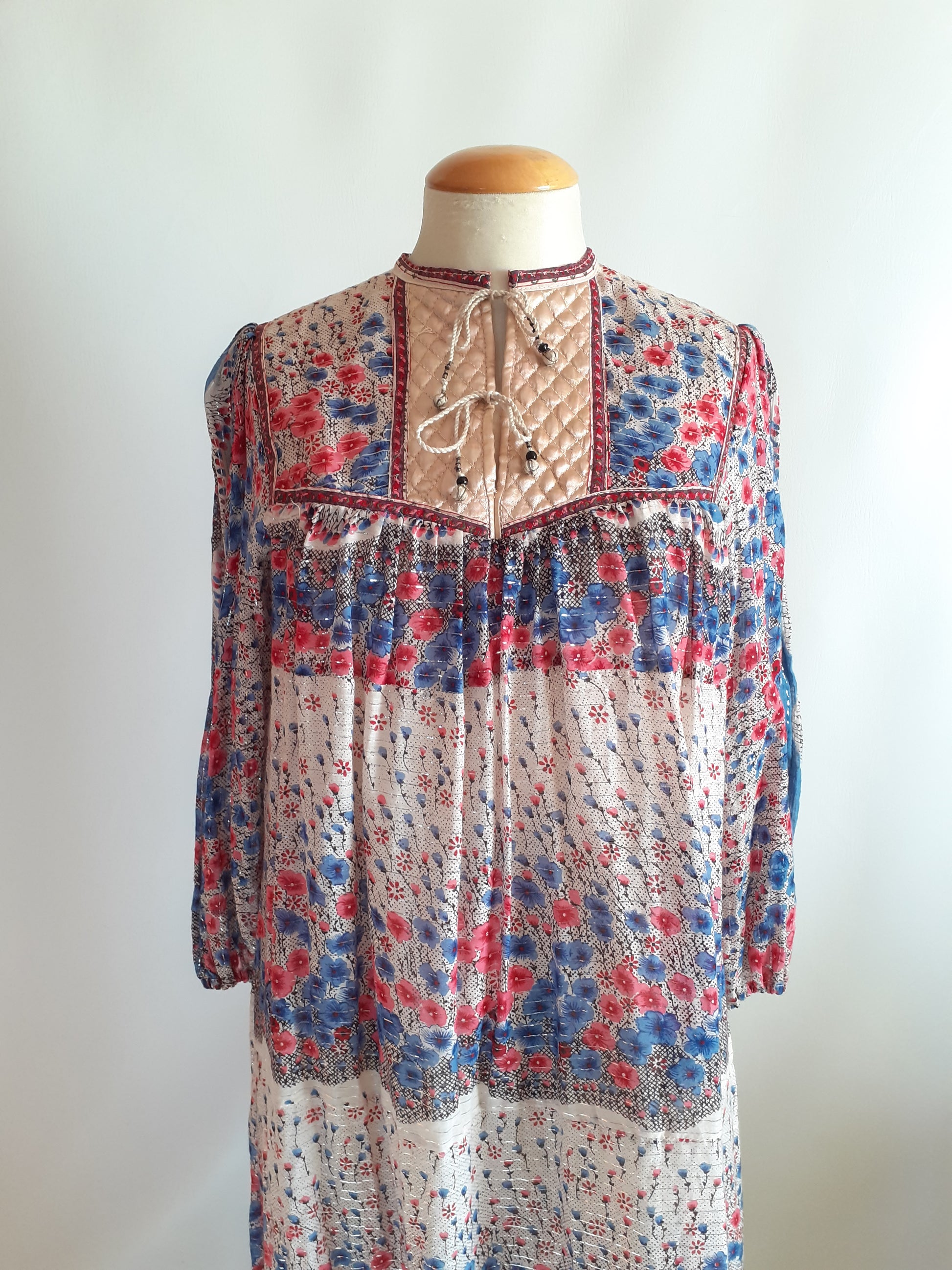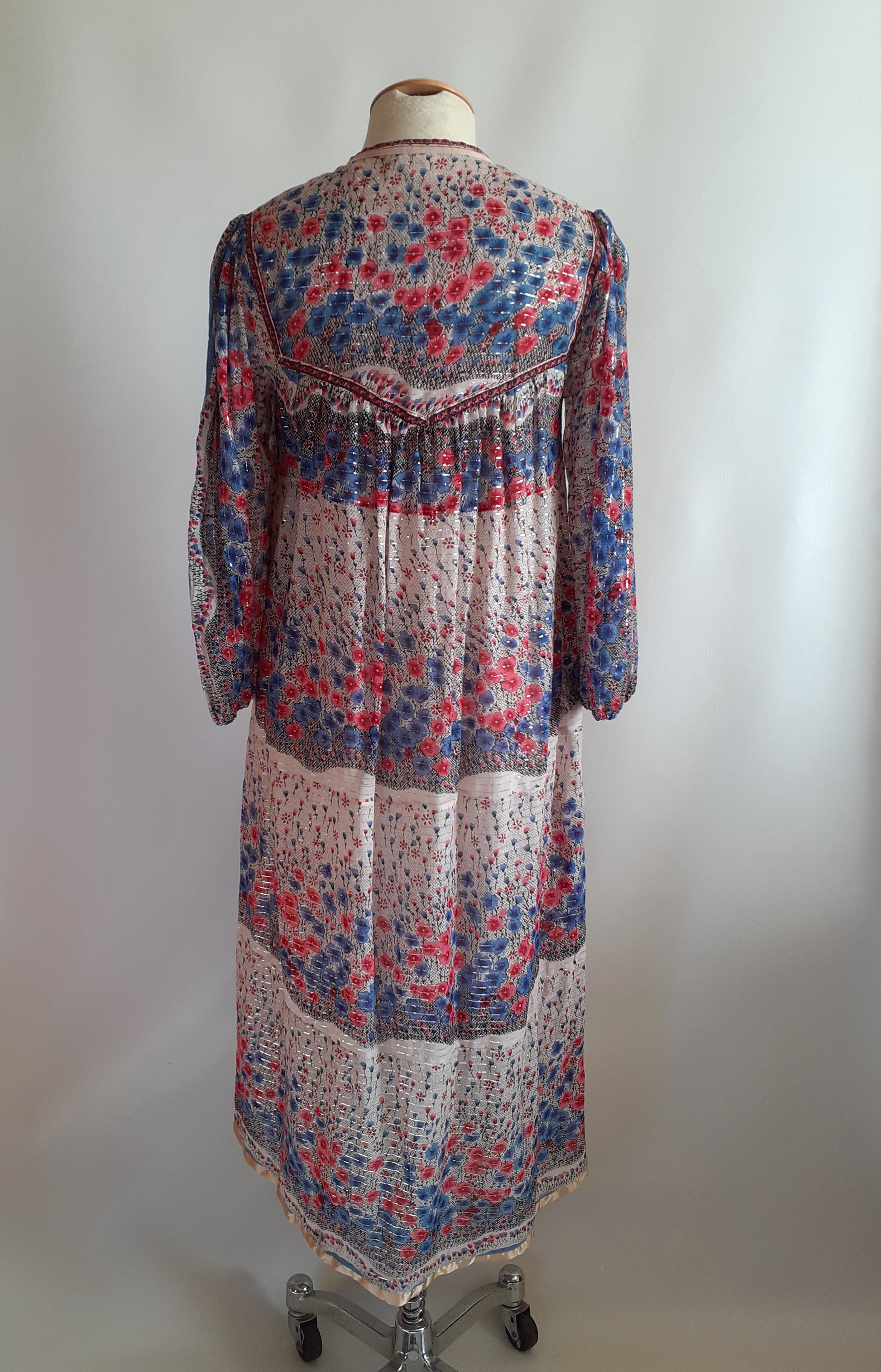 A lovely Indian cotton gauze dress with metallic fibre. It ties at the neck and has a gathered bust and loose fit. The fabric is very light and soft. It has a light muslin lining. It has a bracelet sleeve and is mid-calf length