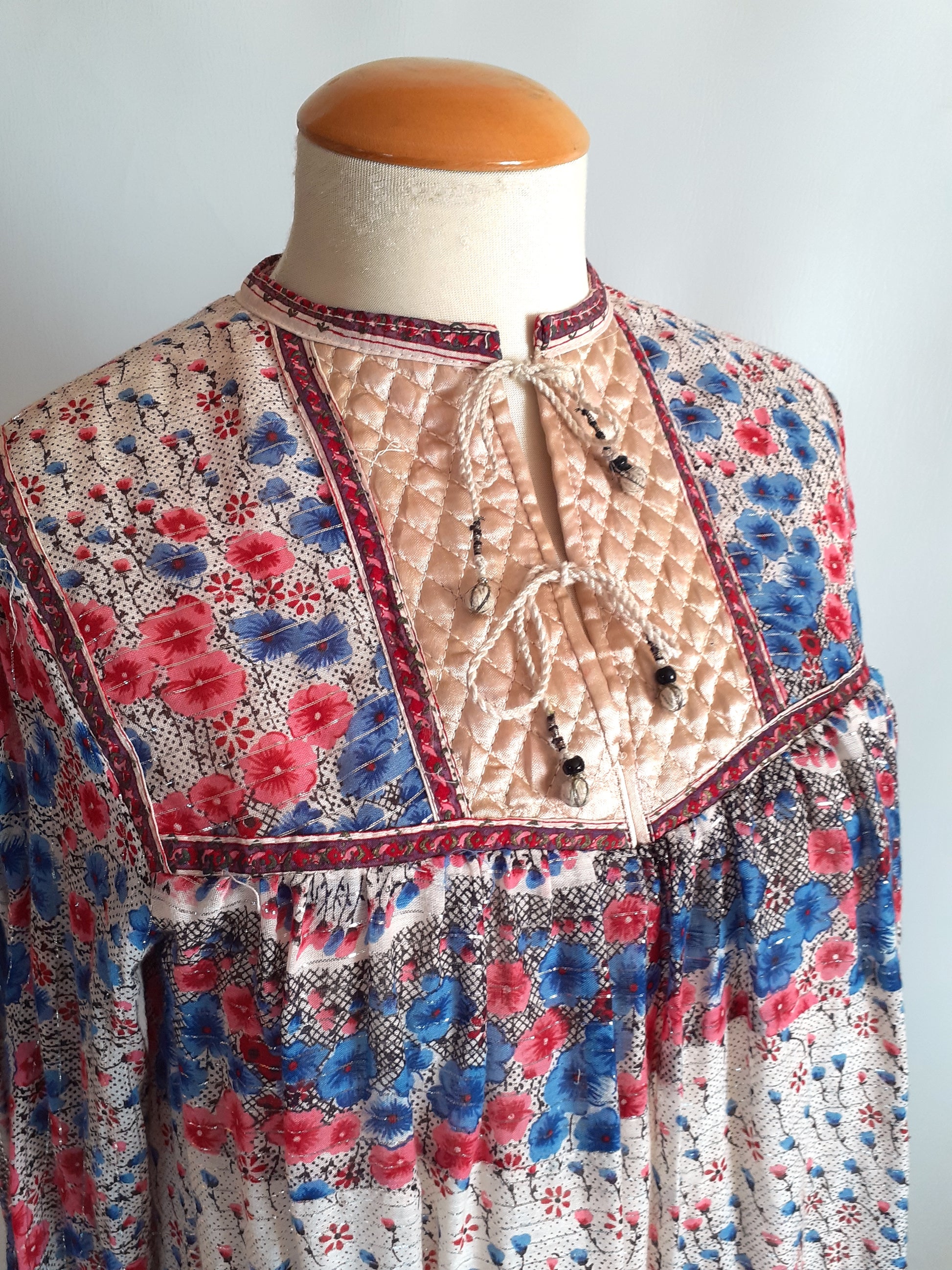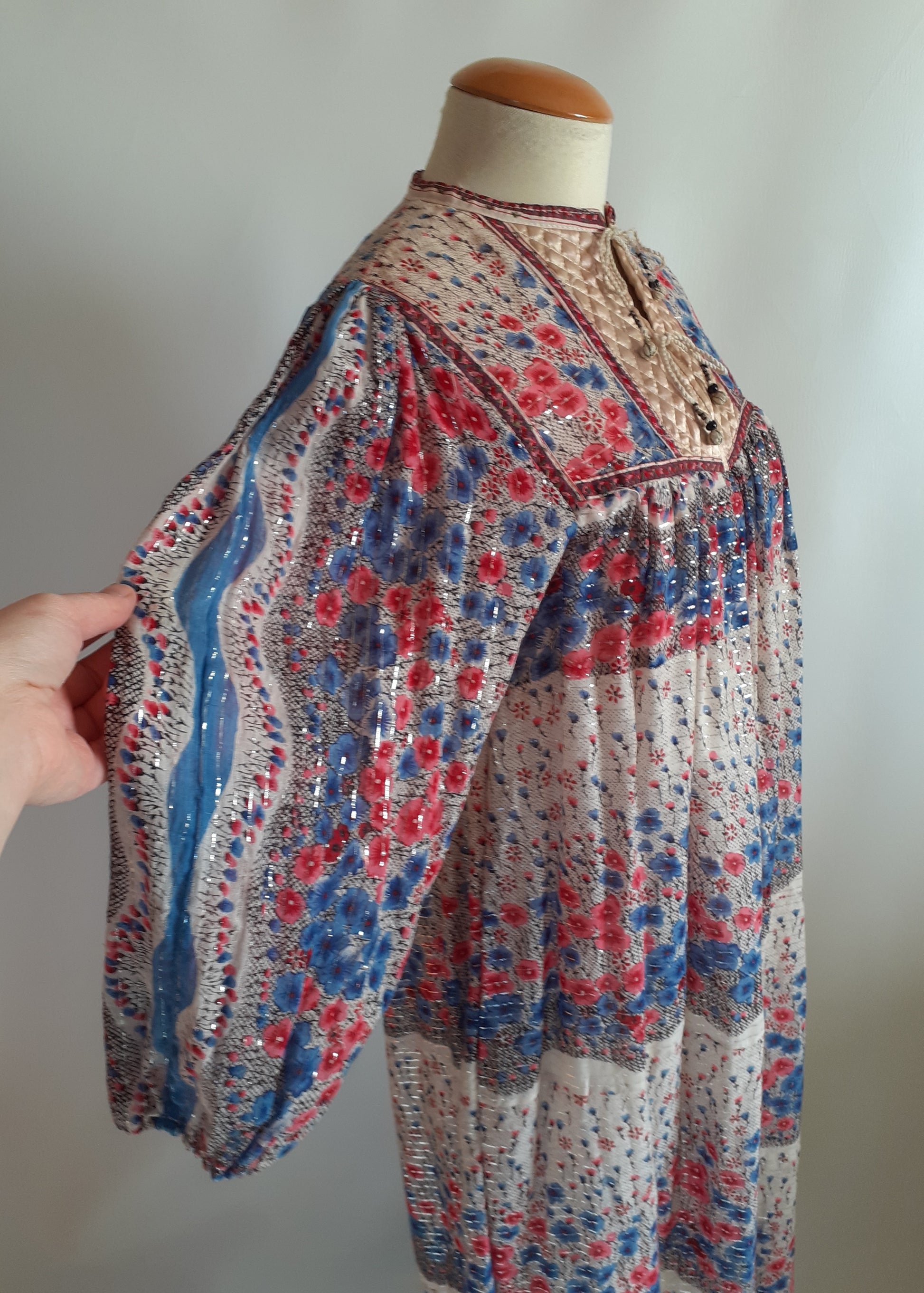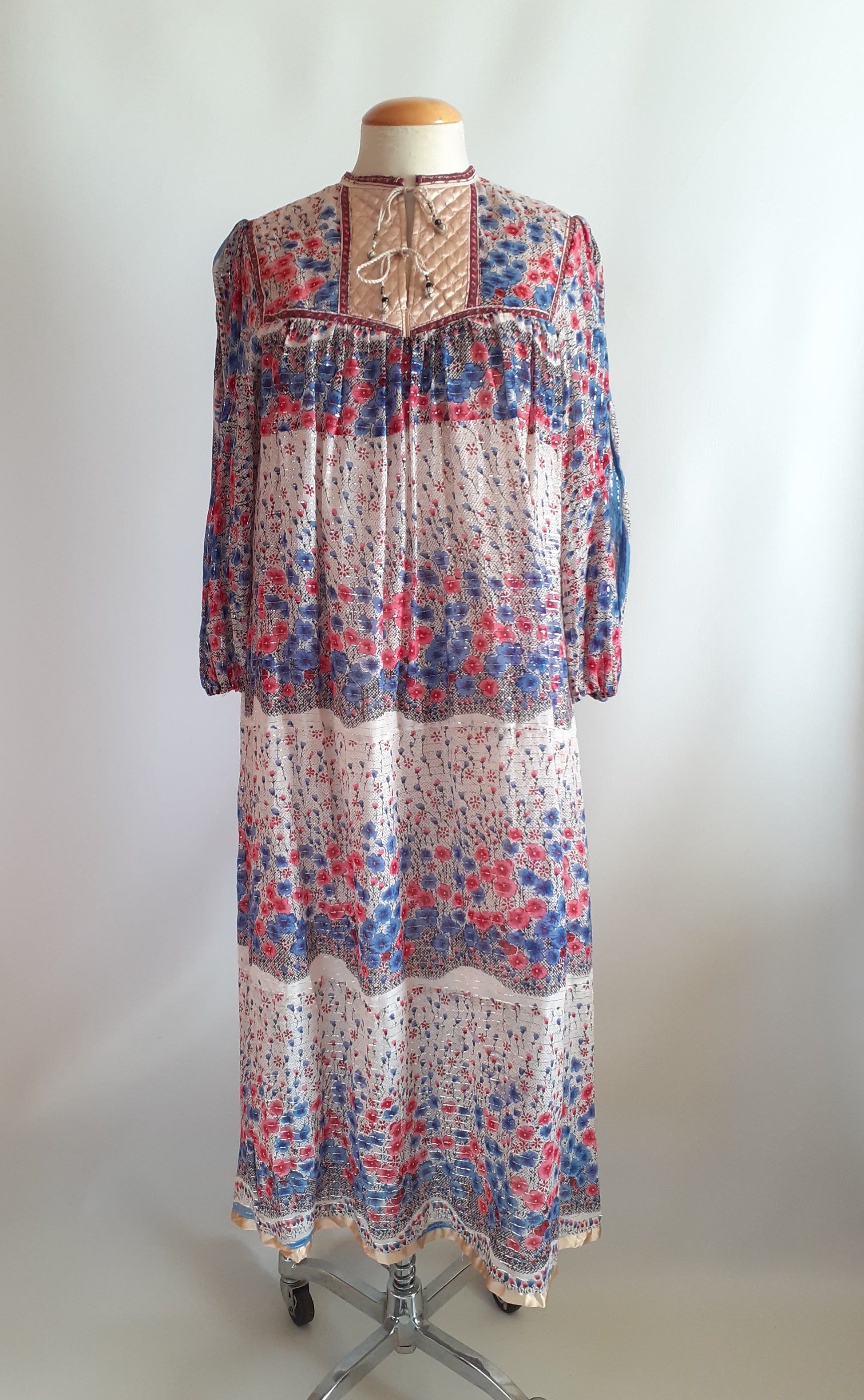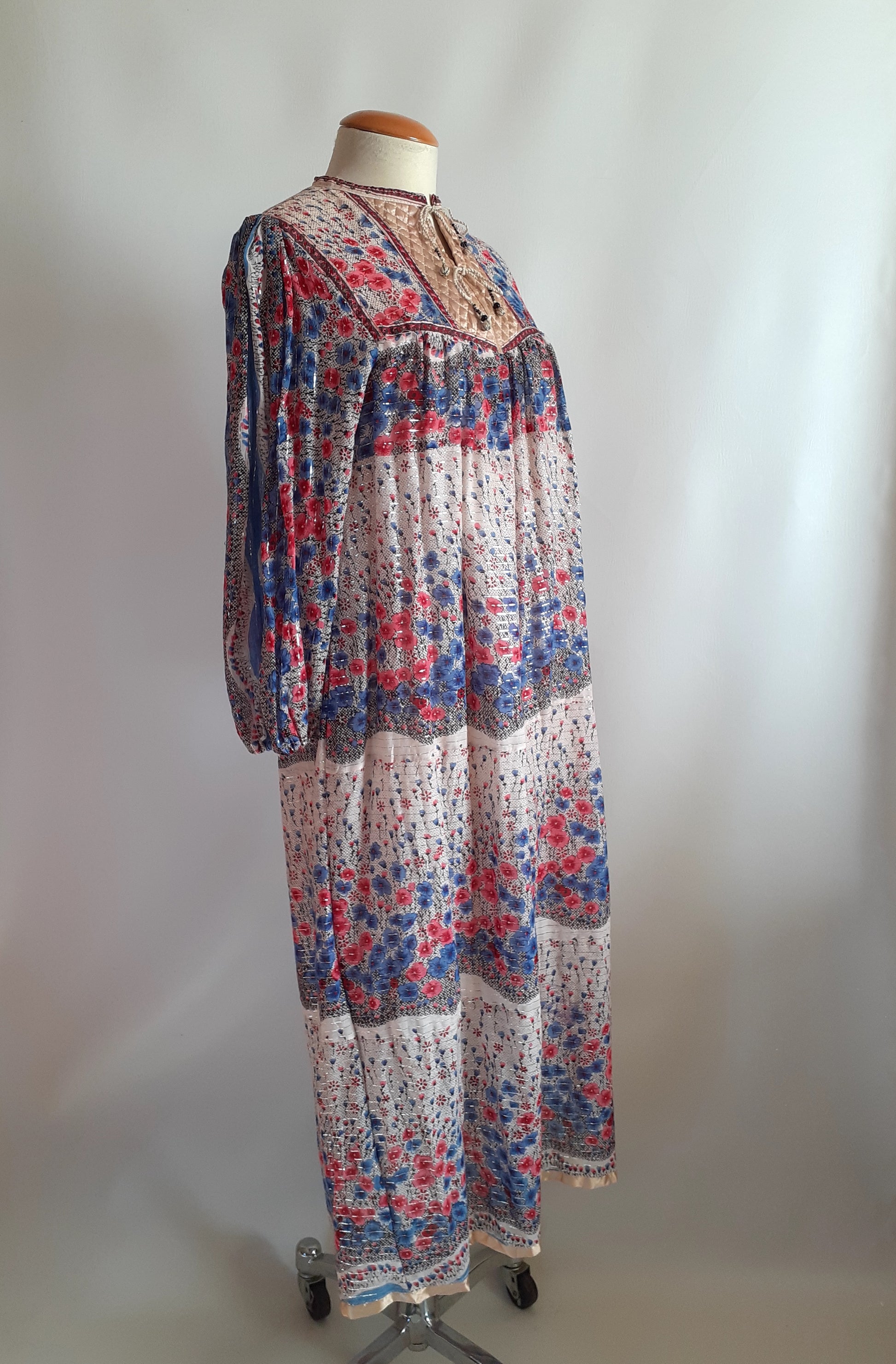 A lovely Indian cotton gauze dress with metallic fibre. It ties at the neck and has a gathered bust and loose fit. The fabric is very light and soft. It has a light muslin lining. It has a bracelet sleeve and is mid-calf length