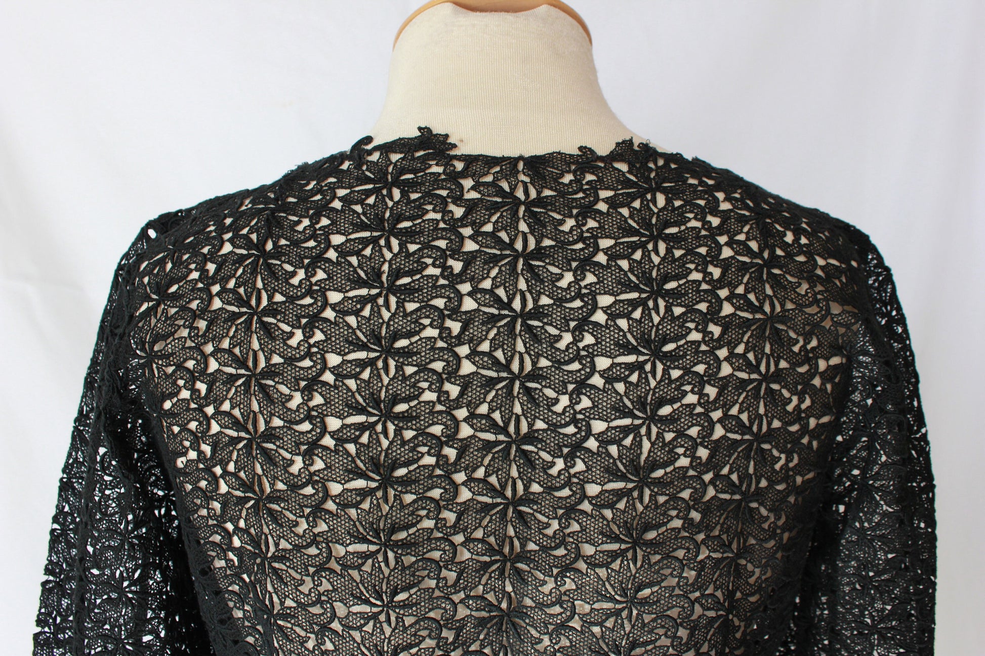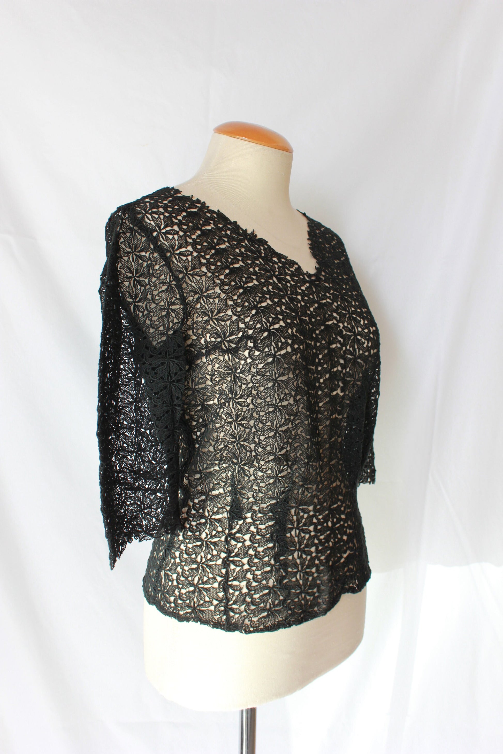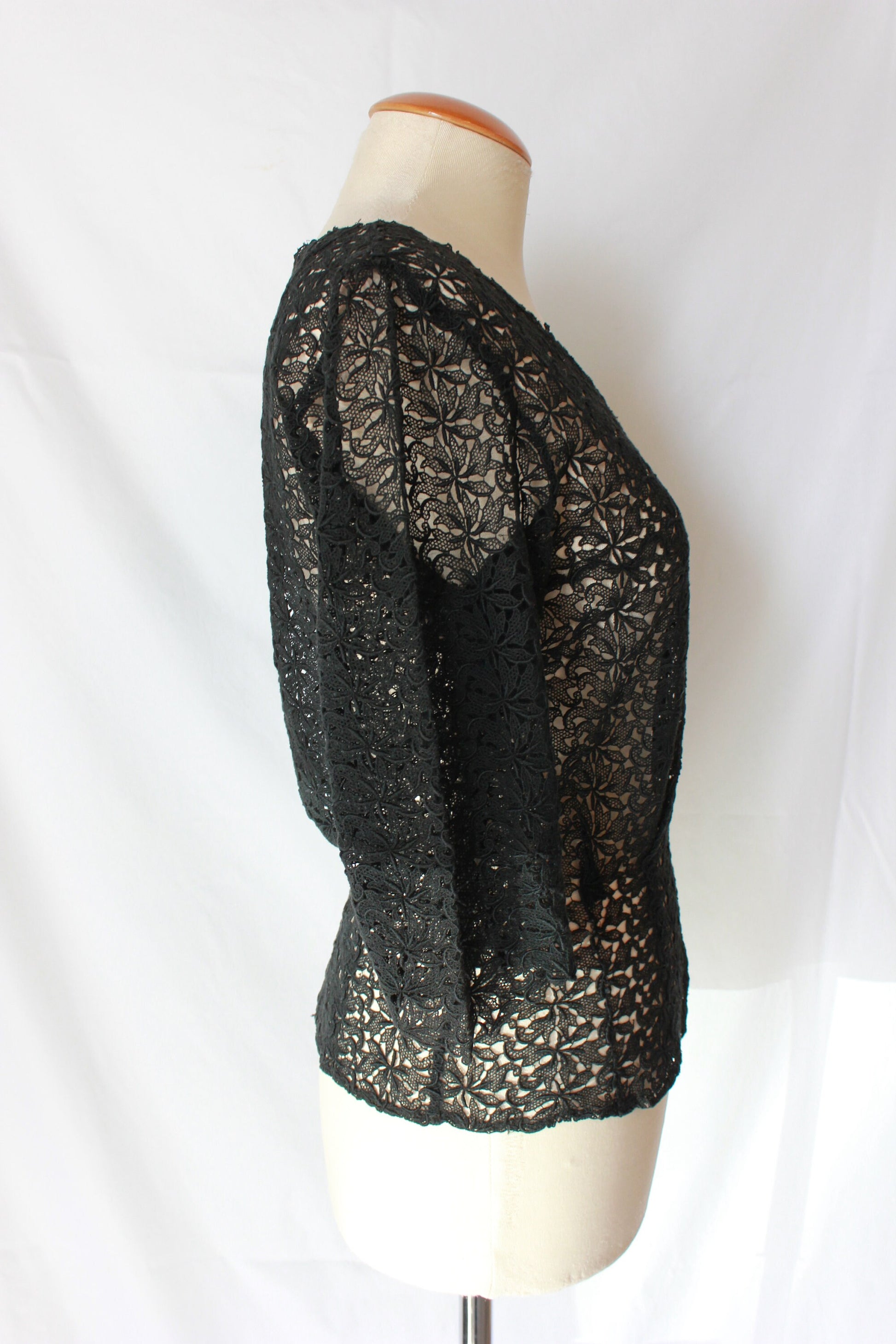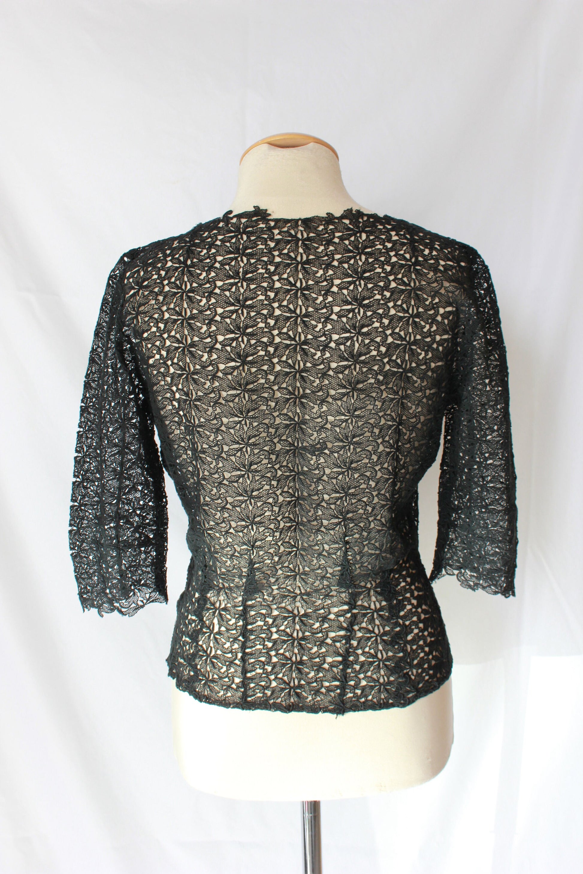 A vintage black lace blouse from the 1950s. It has a zipper on the side. The lace appears to be made of cotton. It's in great condition with no major flaws to note. There is no size tag but it fits like a small to medium. Label: Willy Zürchin