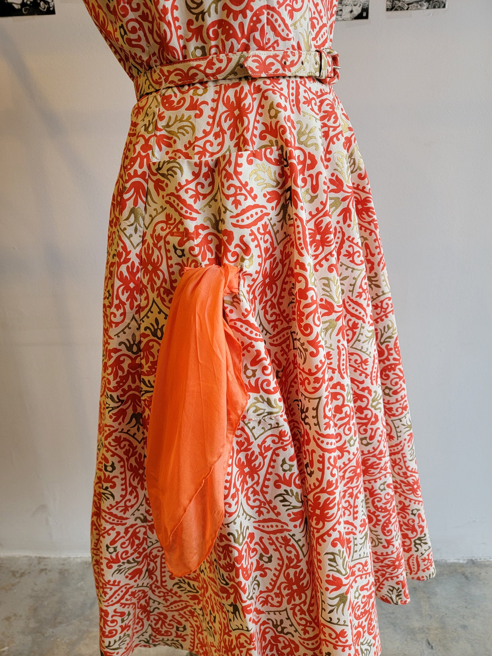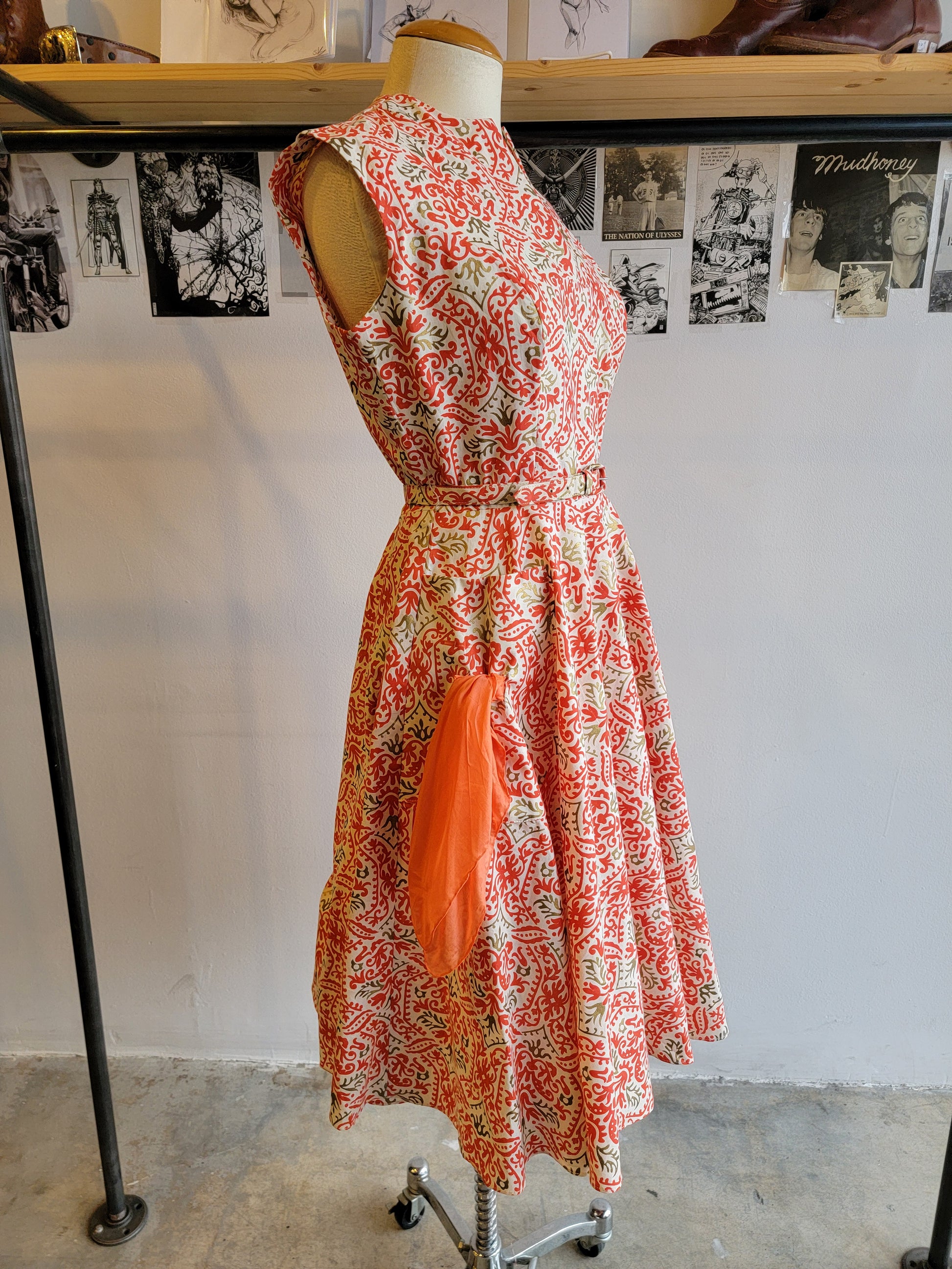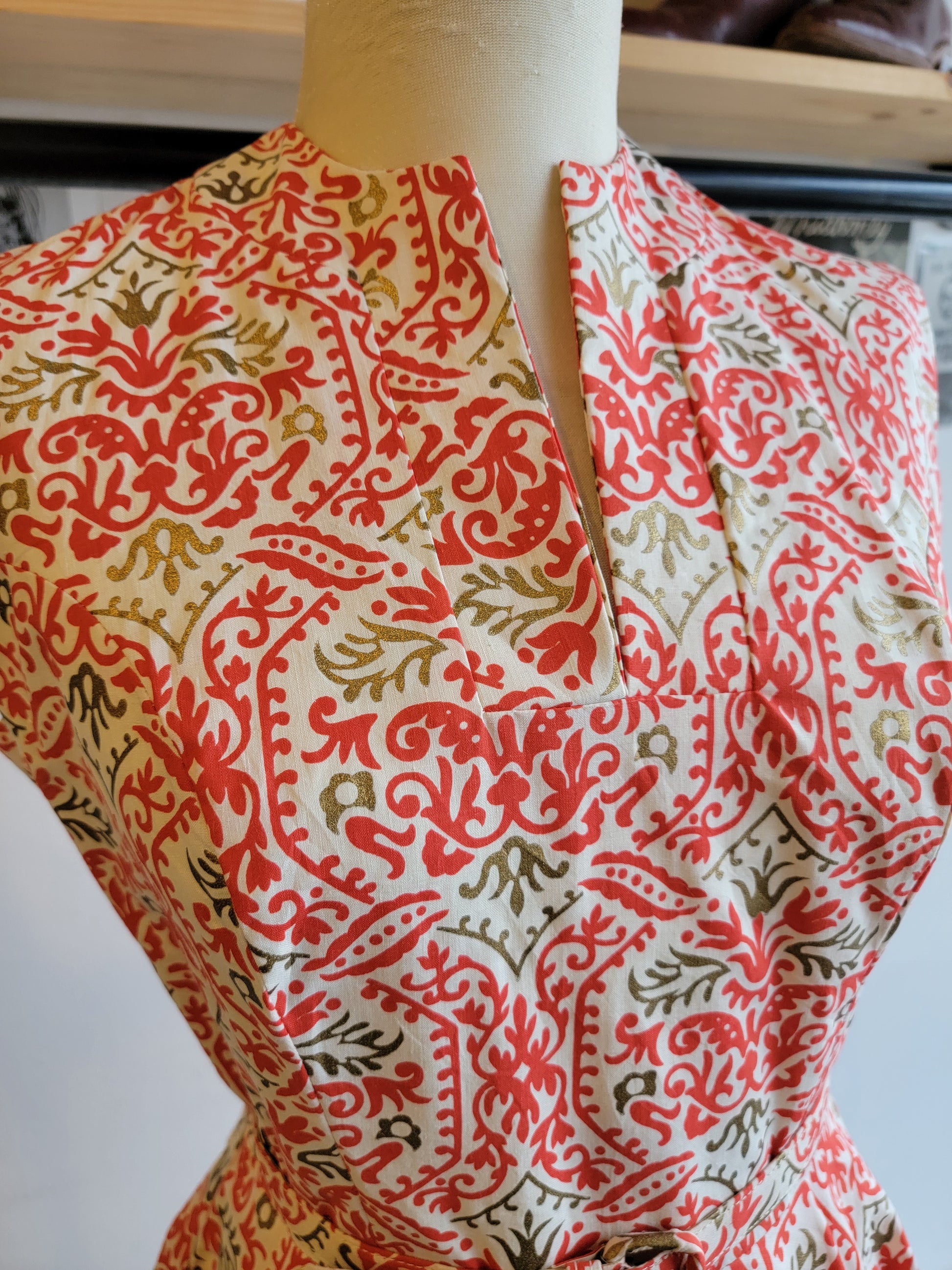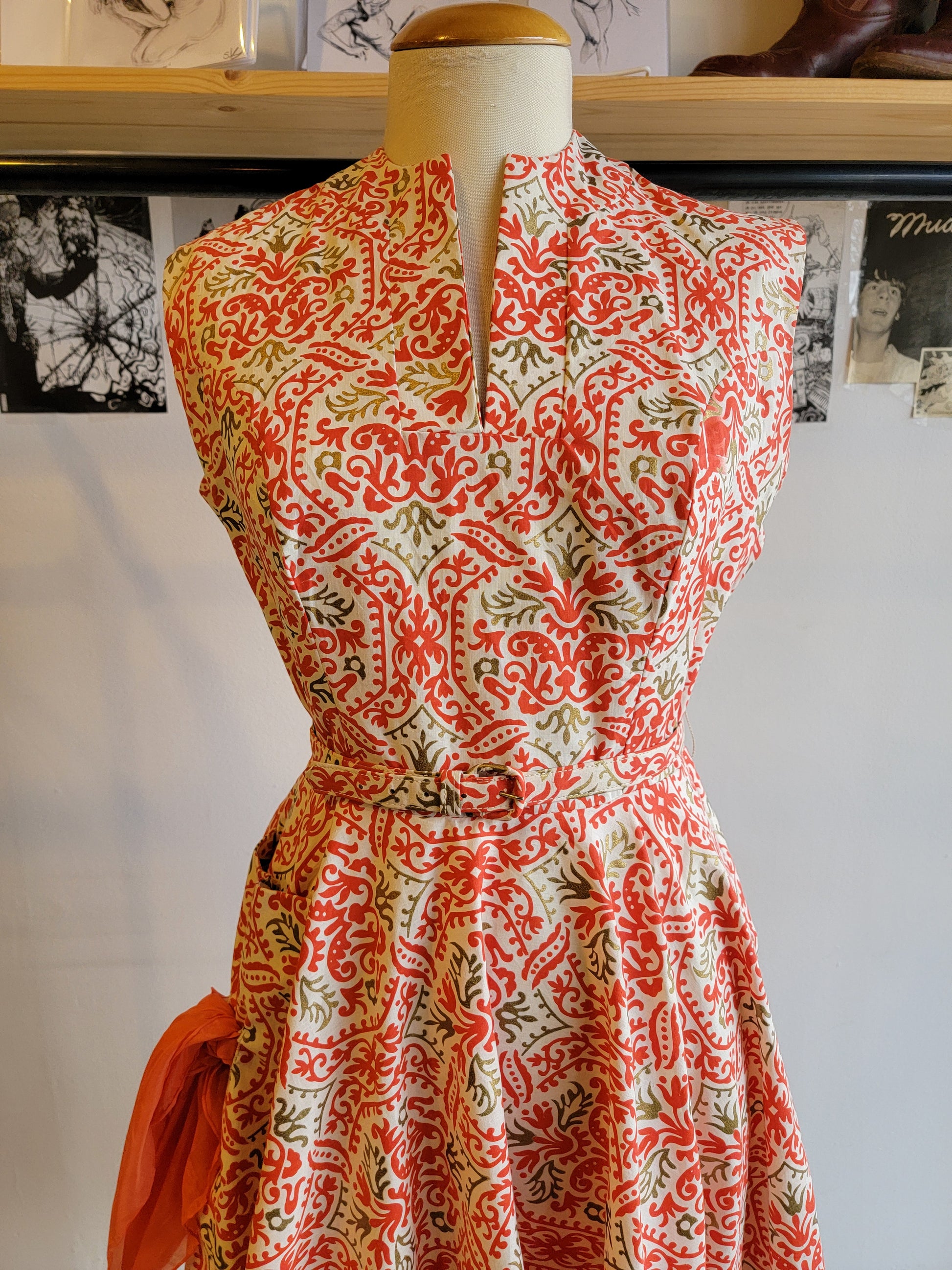 A beautiful 1950s Cotton dress with one large pocket. It has no labels. It's a size smal. It's in excellent condition with no flaws to note. The fabric may be be block printed and it is red and gold on white.