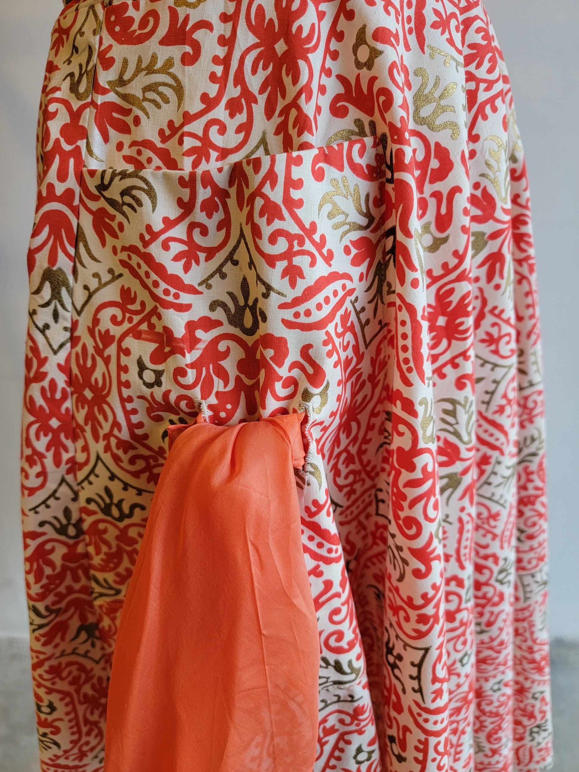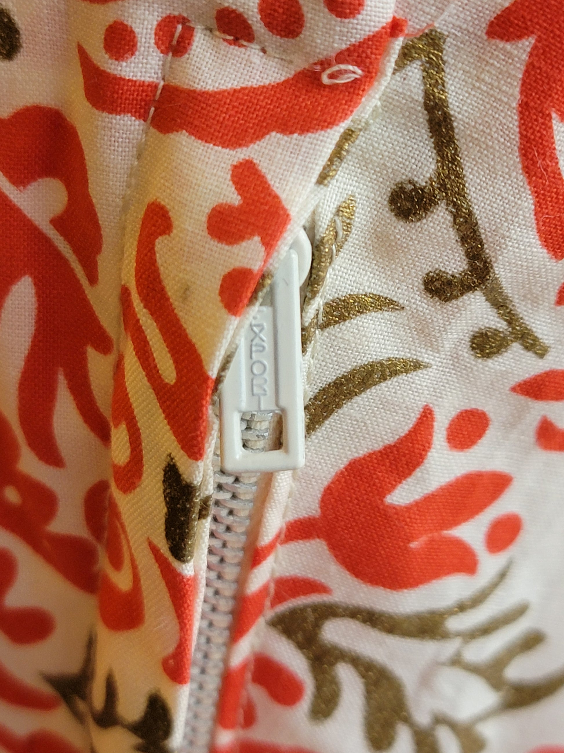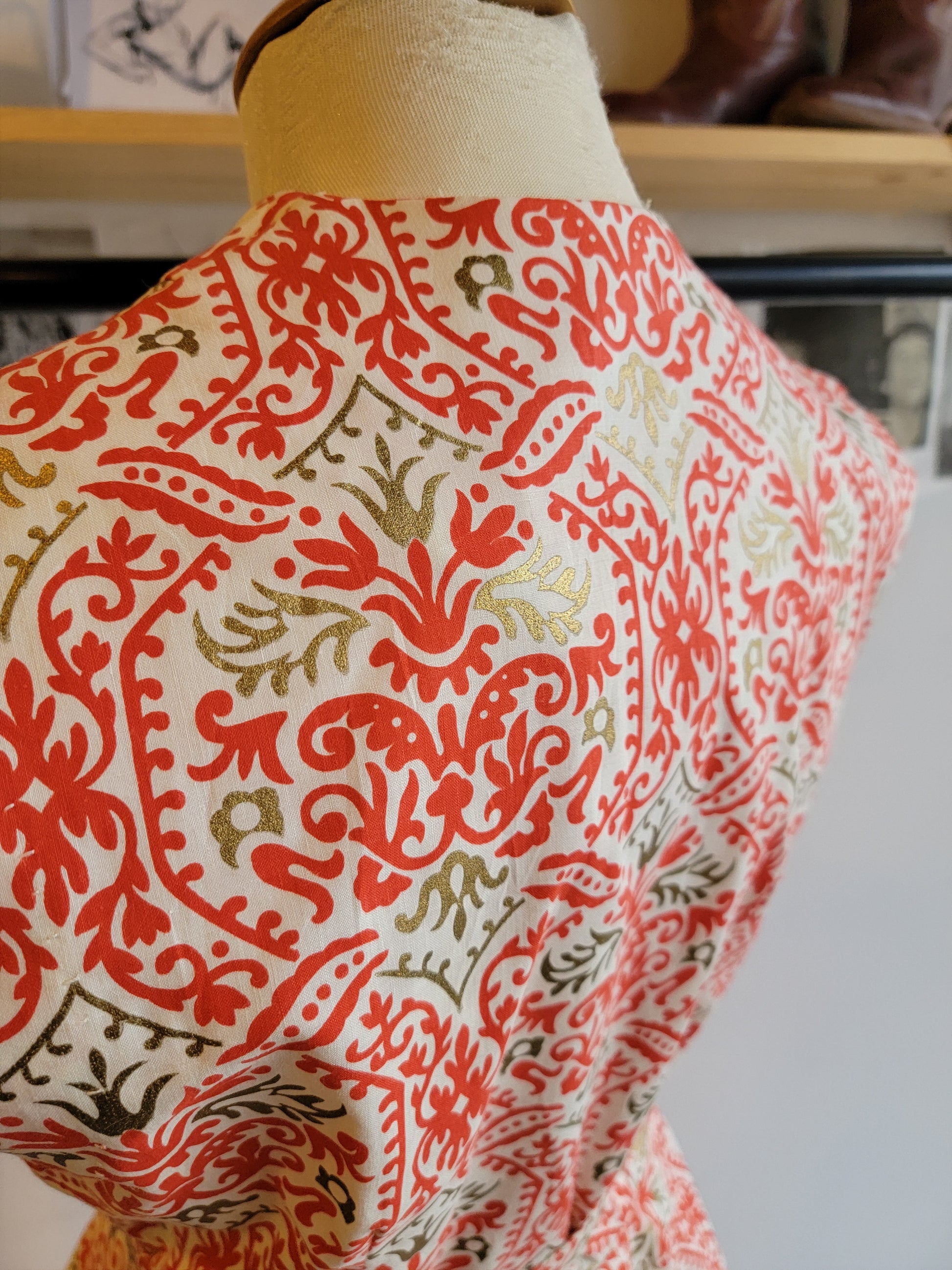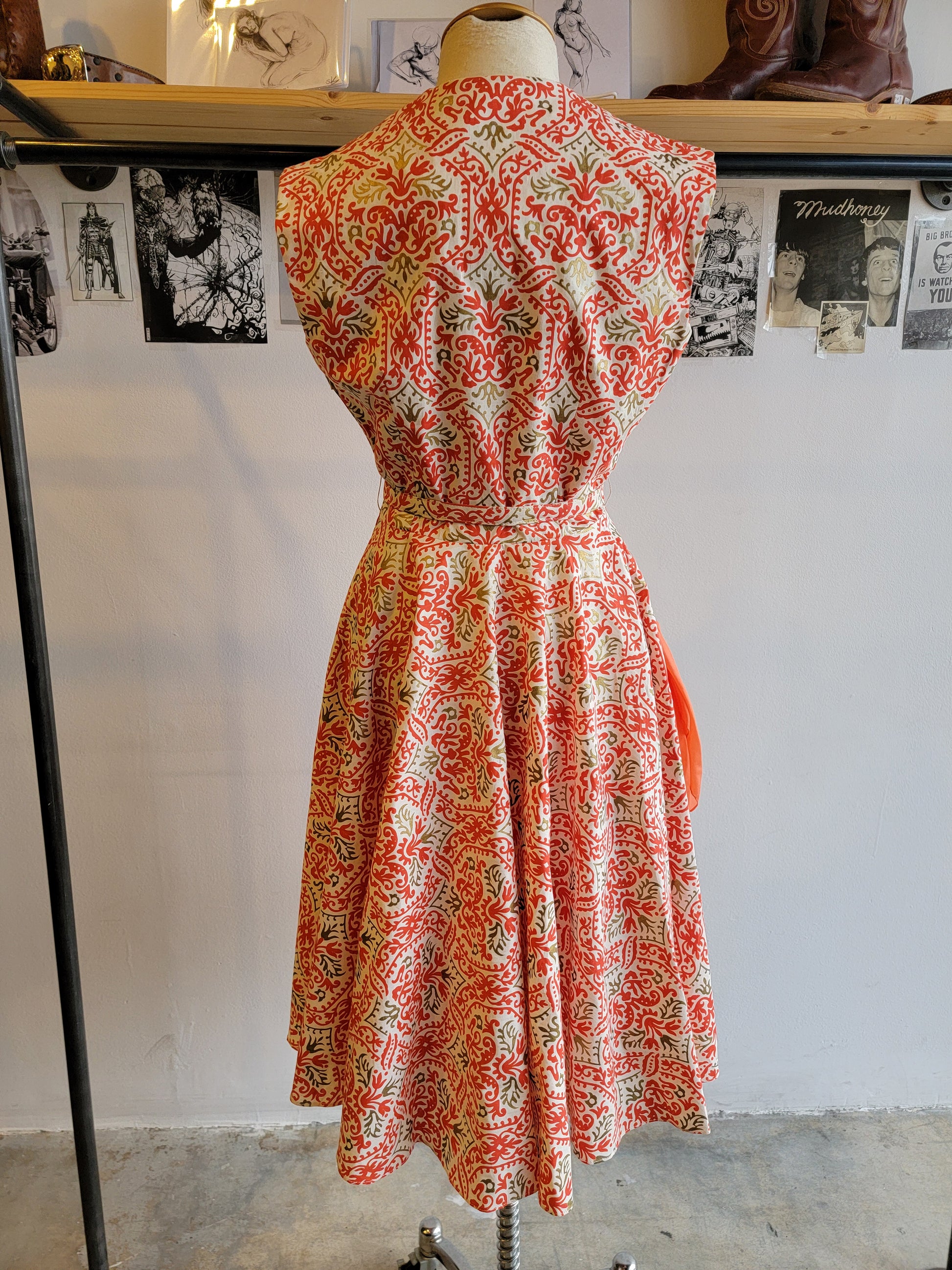 A beautiful 1950s Cotton dress with one large pocket. It has no labels. It's a size smal. It's in excellent condition with no flaws to note. The fabric may be be block printed and it is red and gold on white.