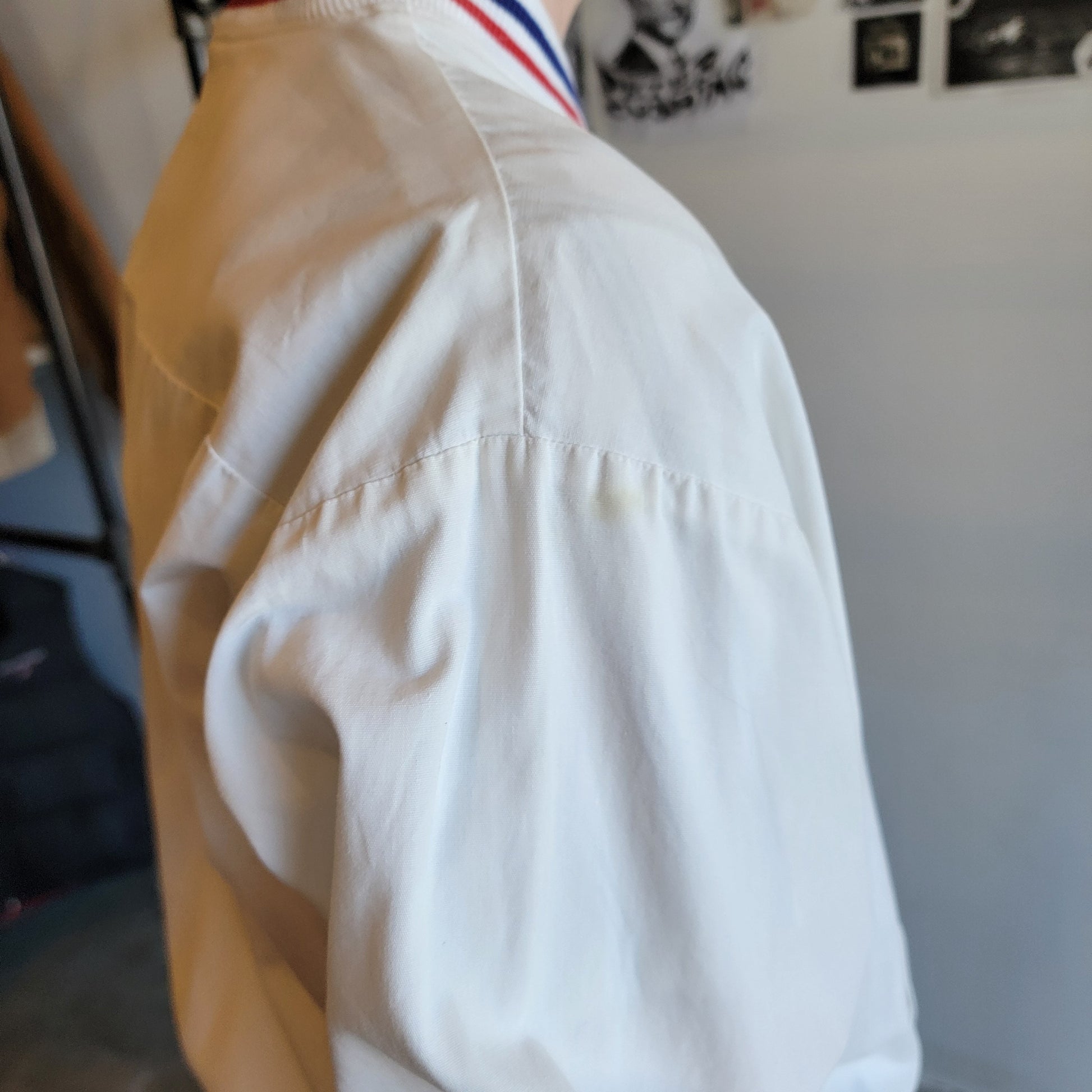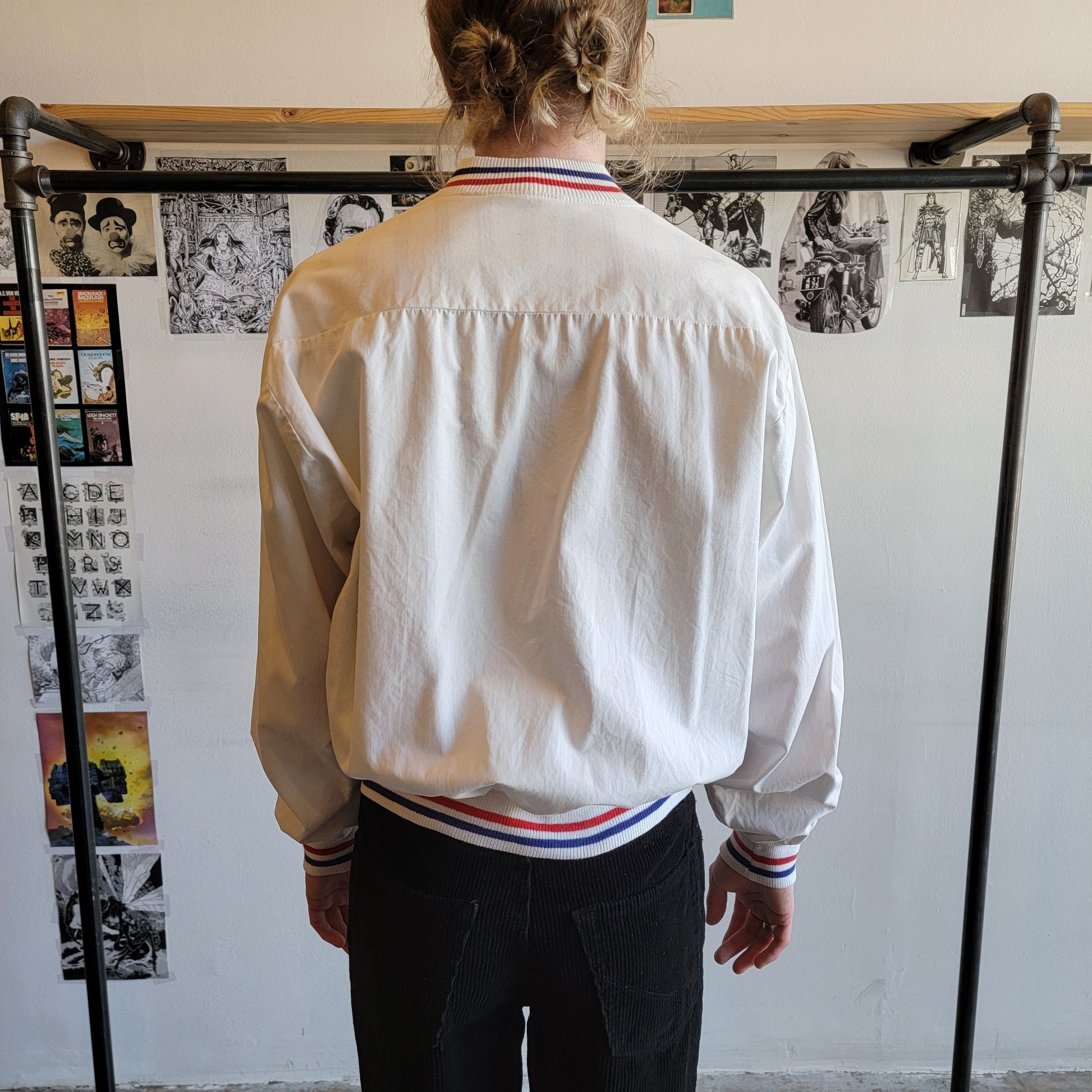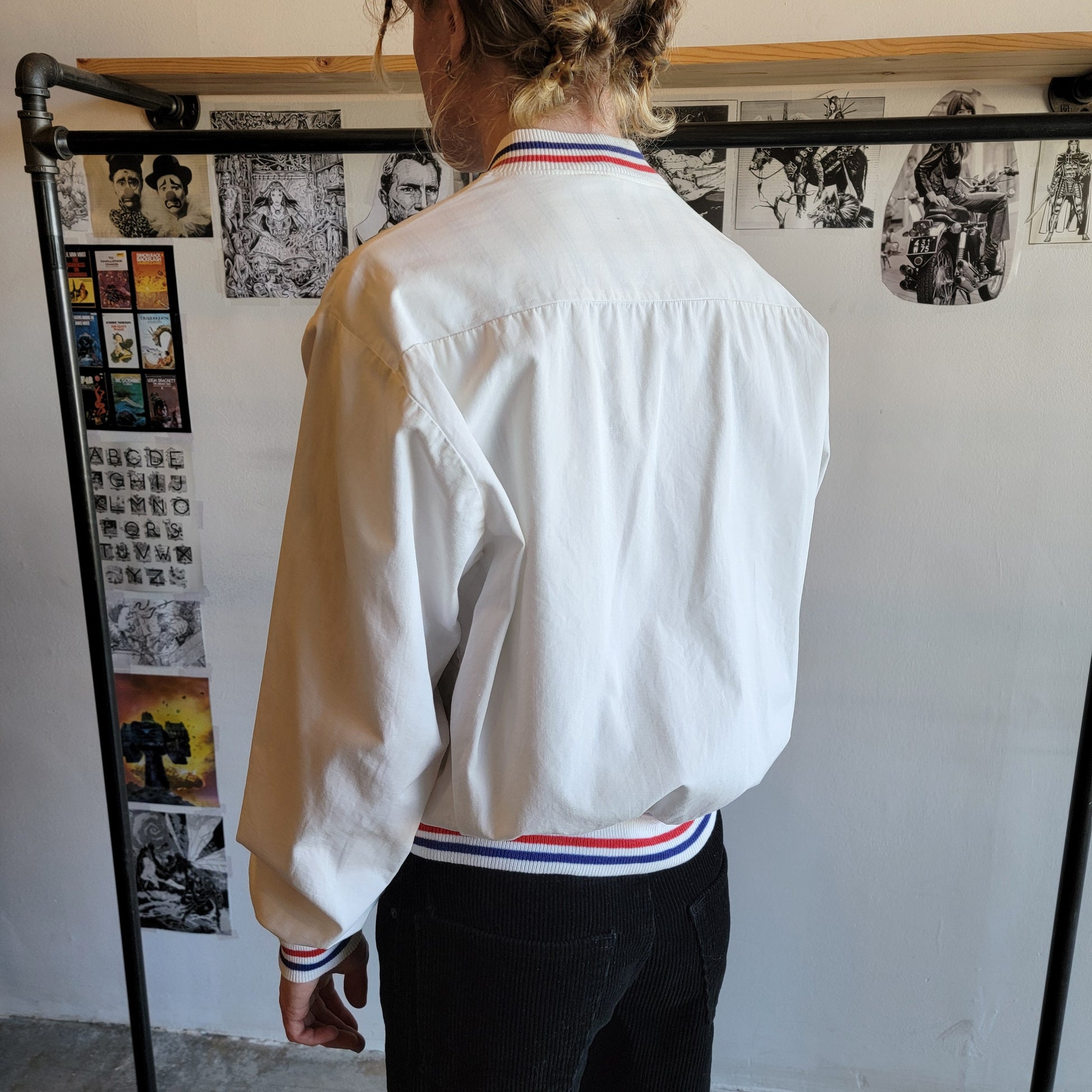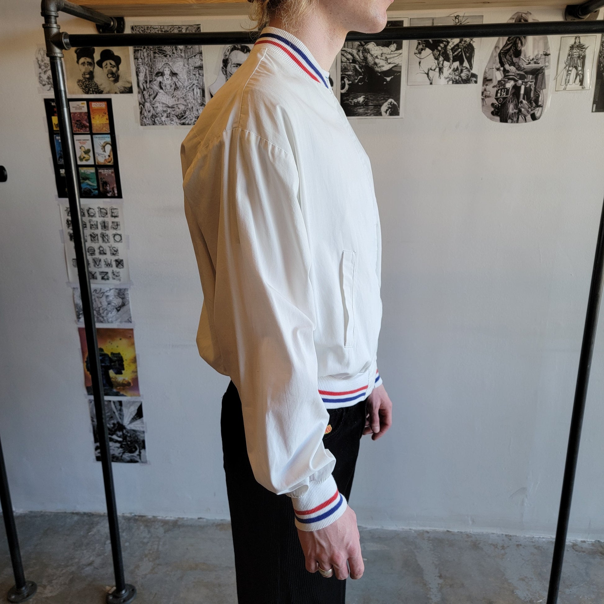 A simple and classic varsity style bomber jacket with no logos, just plain. It zips up and is unlined. The knit cuffs are cotton as well as the jacket. The size on the tag is large but it fits closer to a medium. The jacket is in excellent condition with a couple minor marks, one faint stain on one shoulder and a couple light pen marks on the other sleeve.