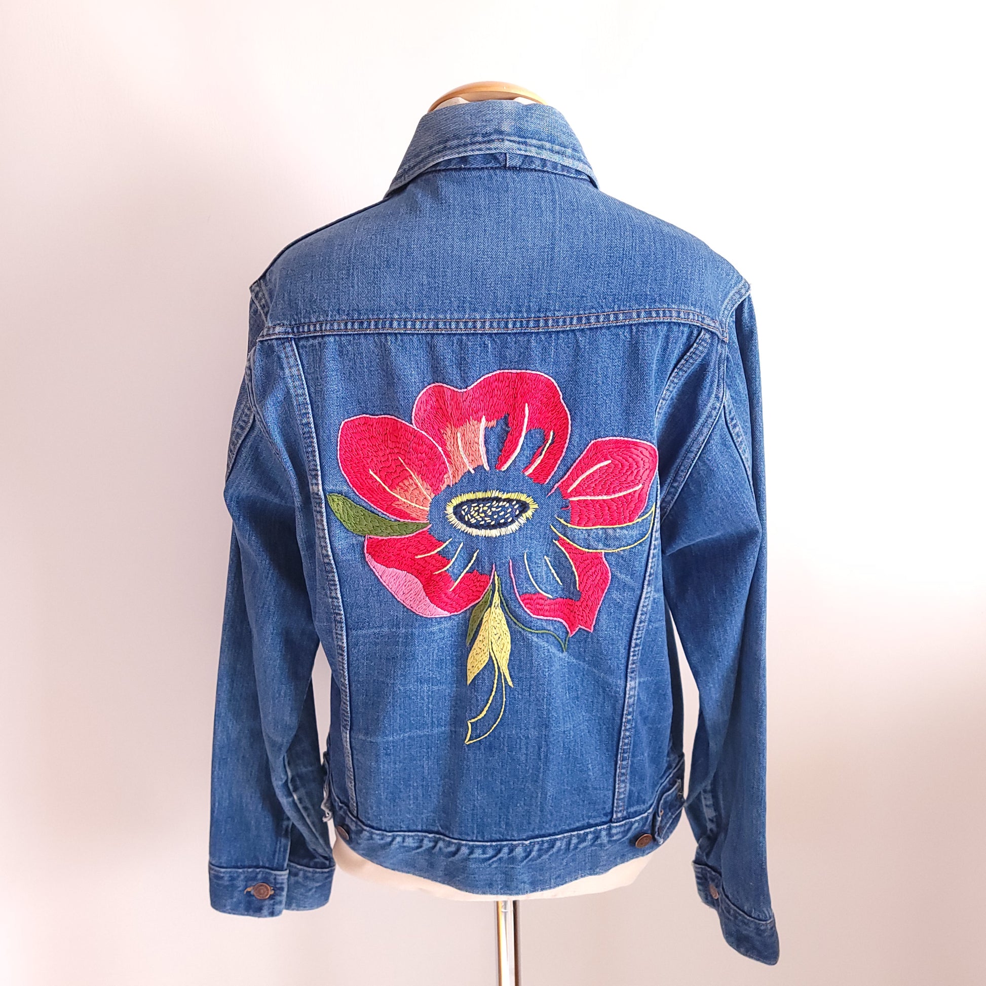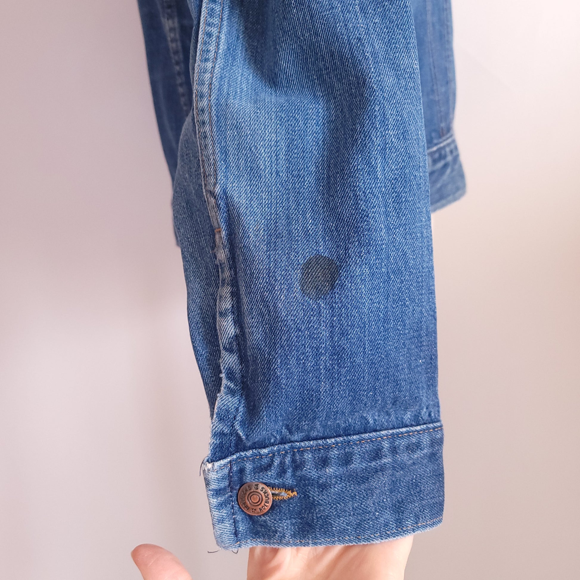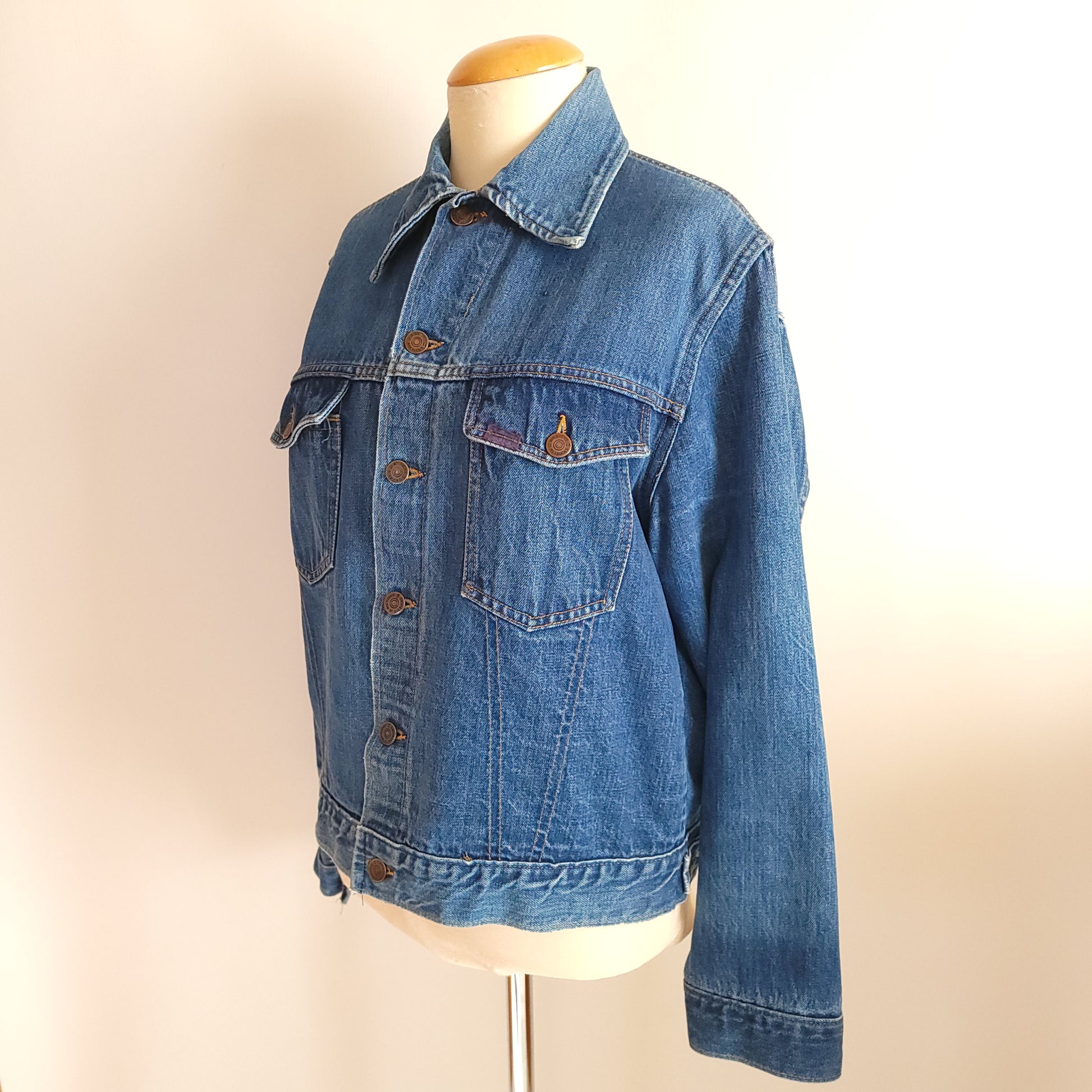A nicely worn 1960s Roebucks denim jacket with a wonderful embroidered flower on the back. The jacket features selvedge denim which makes it collectible. There is one mark on the sleeve but otherwise it's in excellent condition.