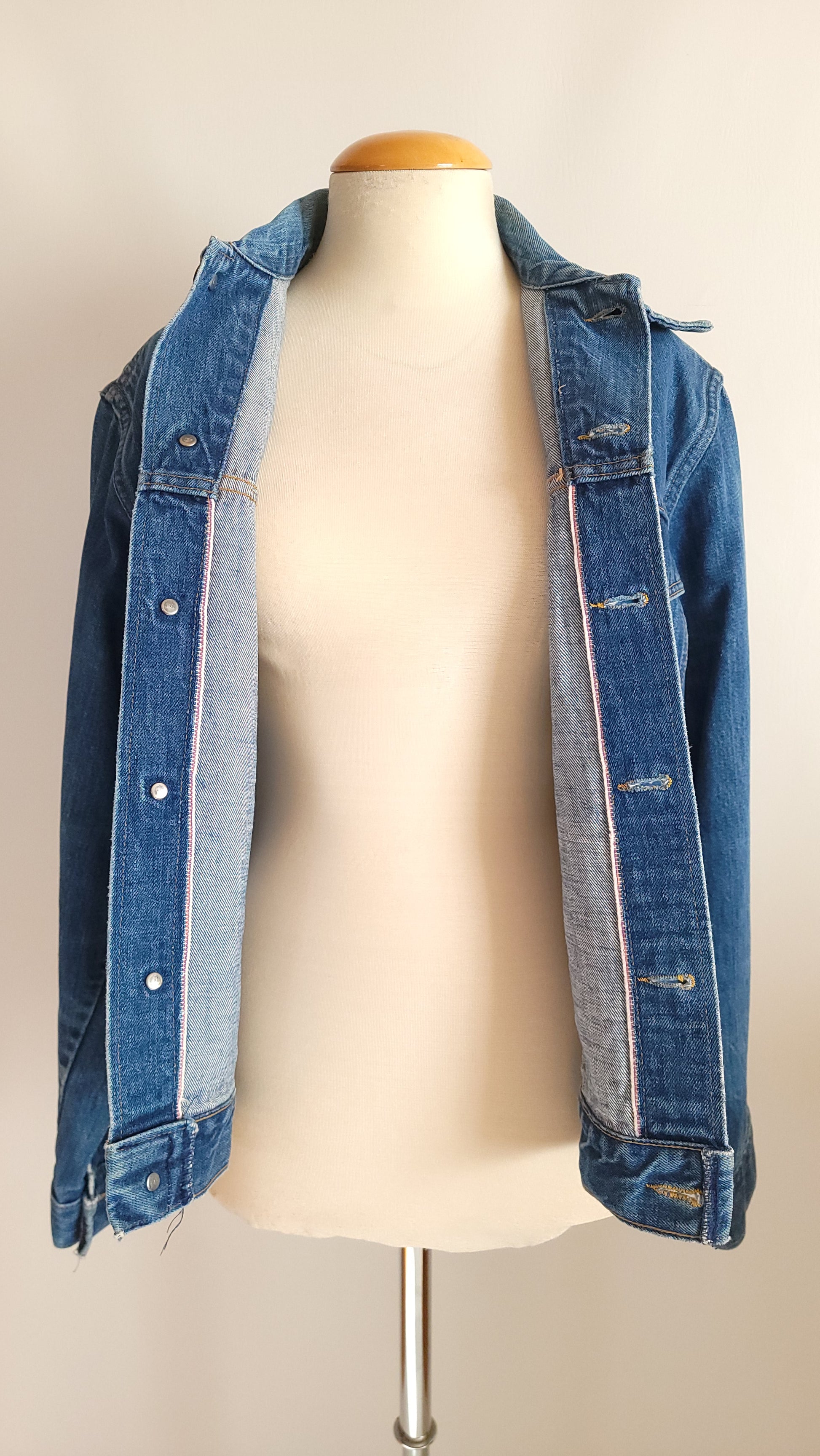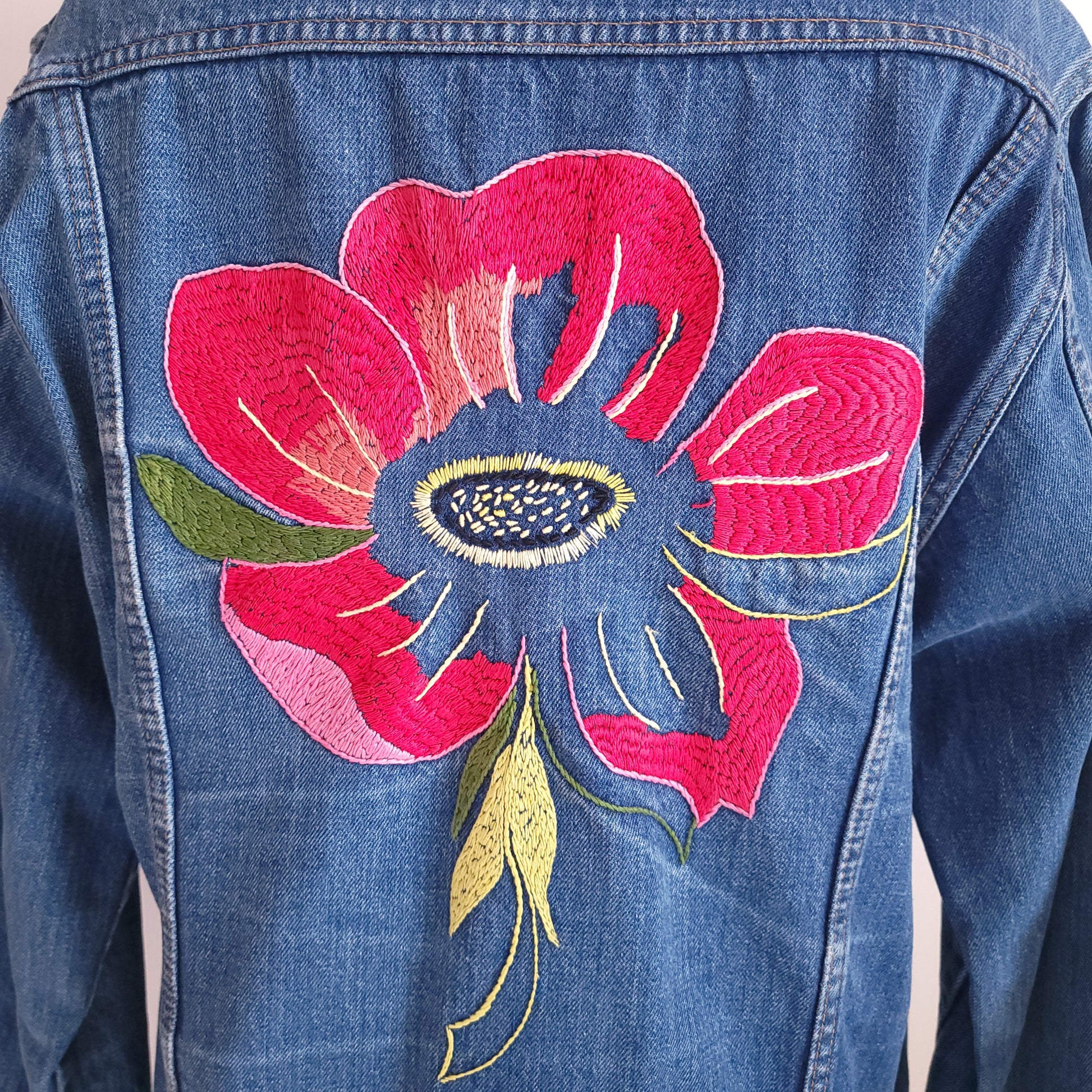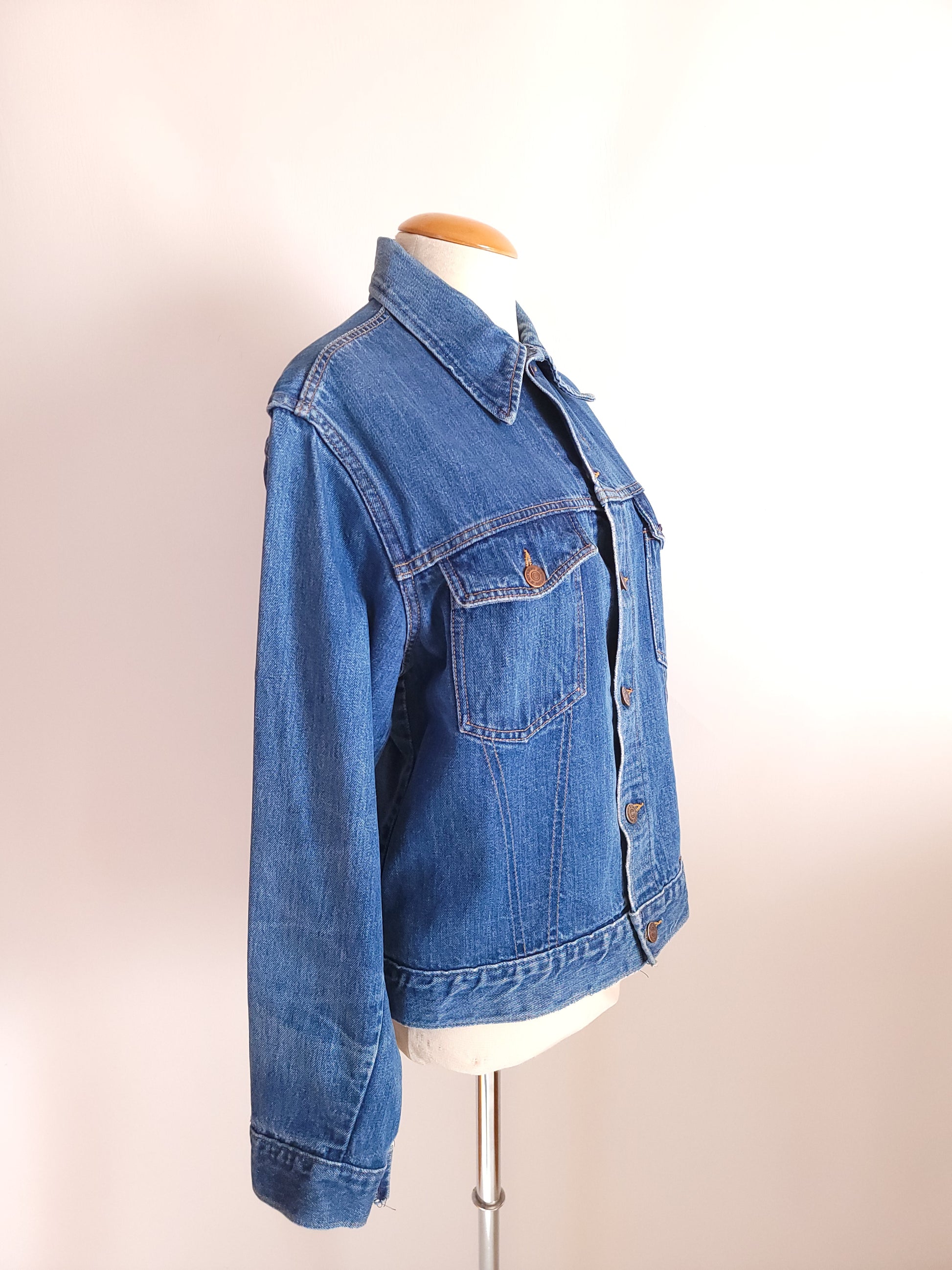 A nicely worn 1960s Roebucks denim jacket with a wonderful embroidered flower on the back. The jacket features selvedge denim which makes it collectible. There is one mark on the sleeve but otherwise it's in excellent condition.