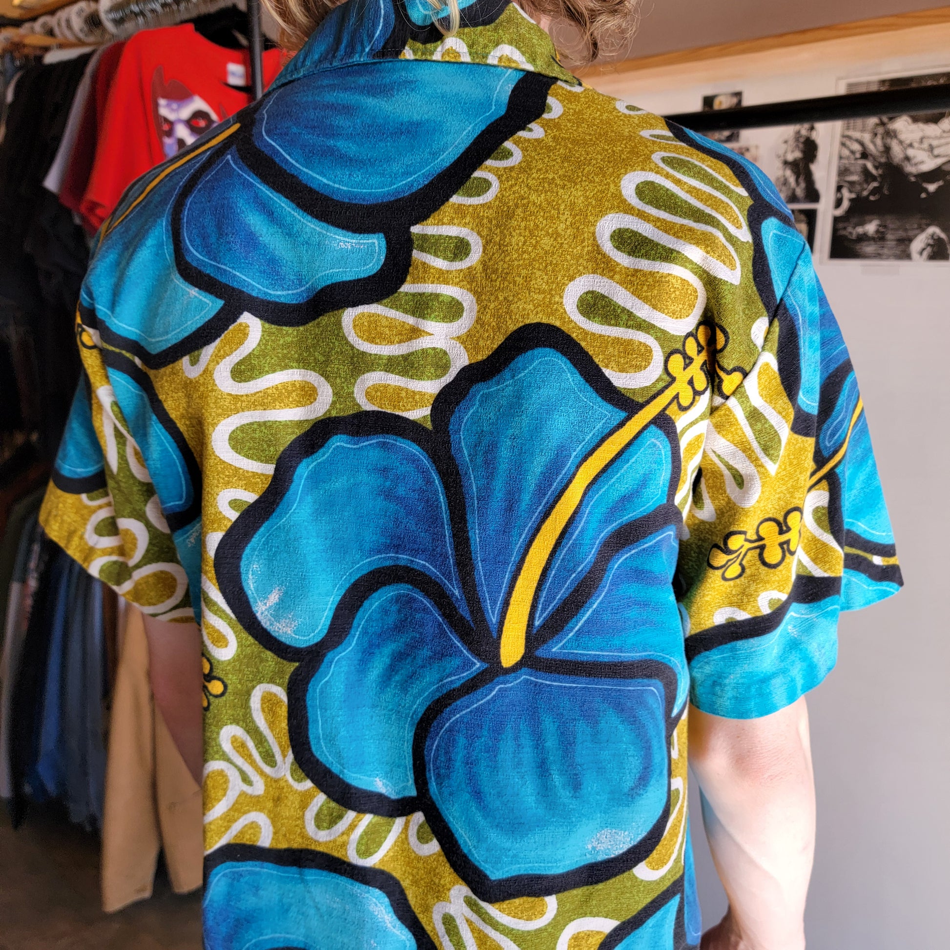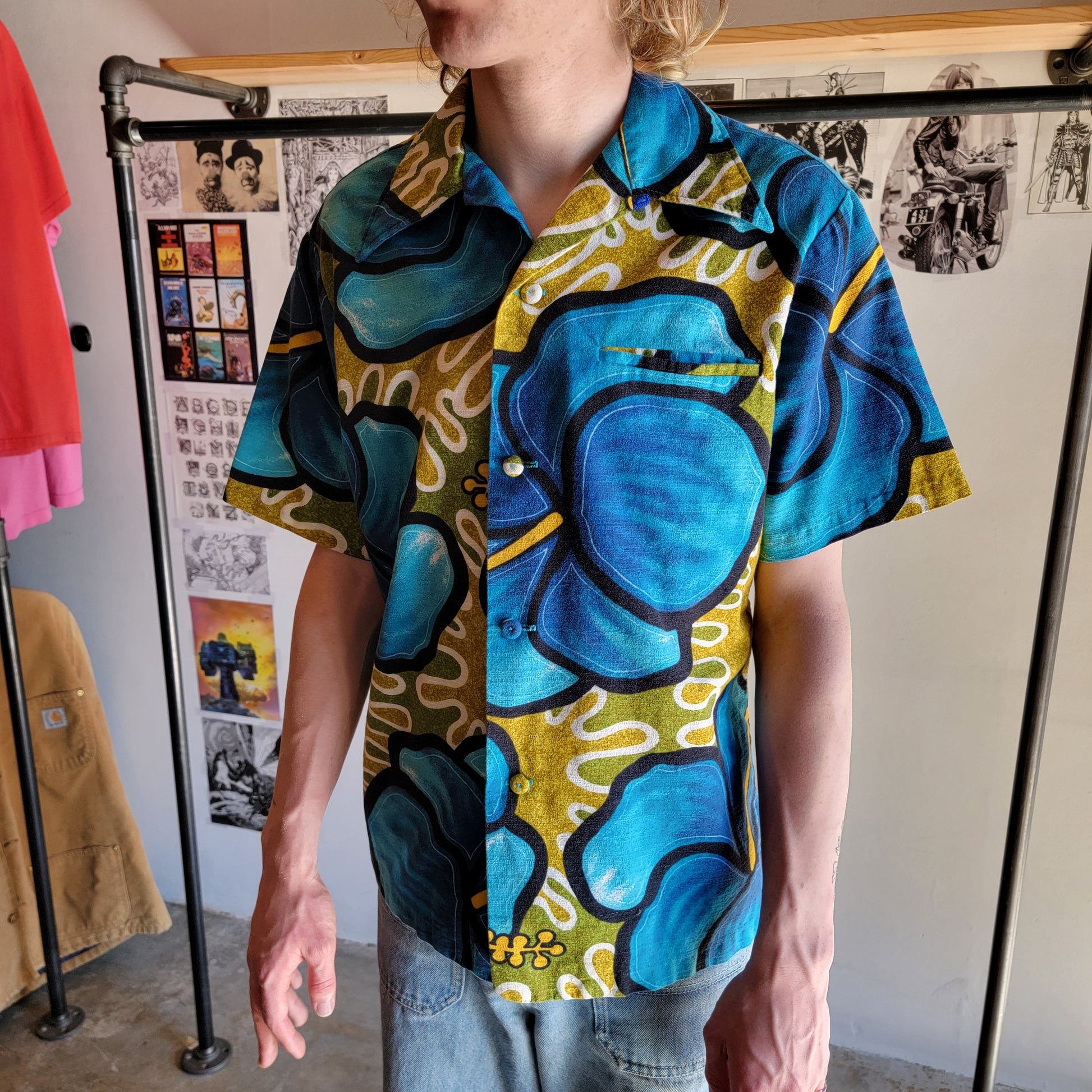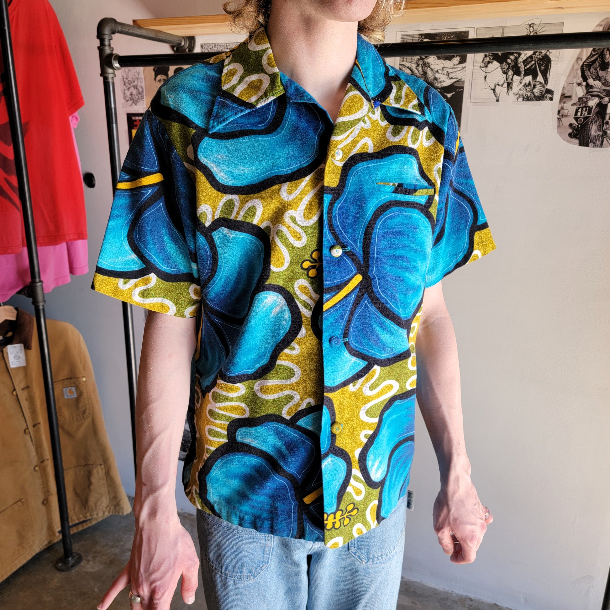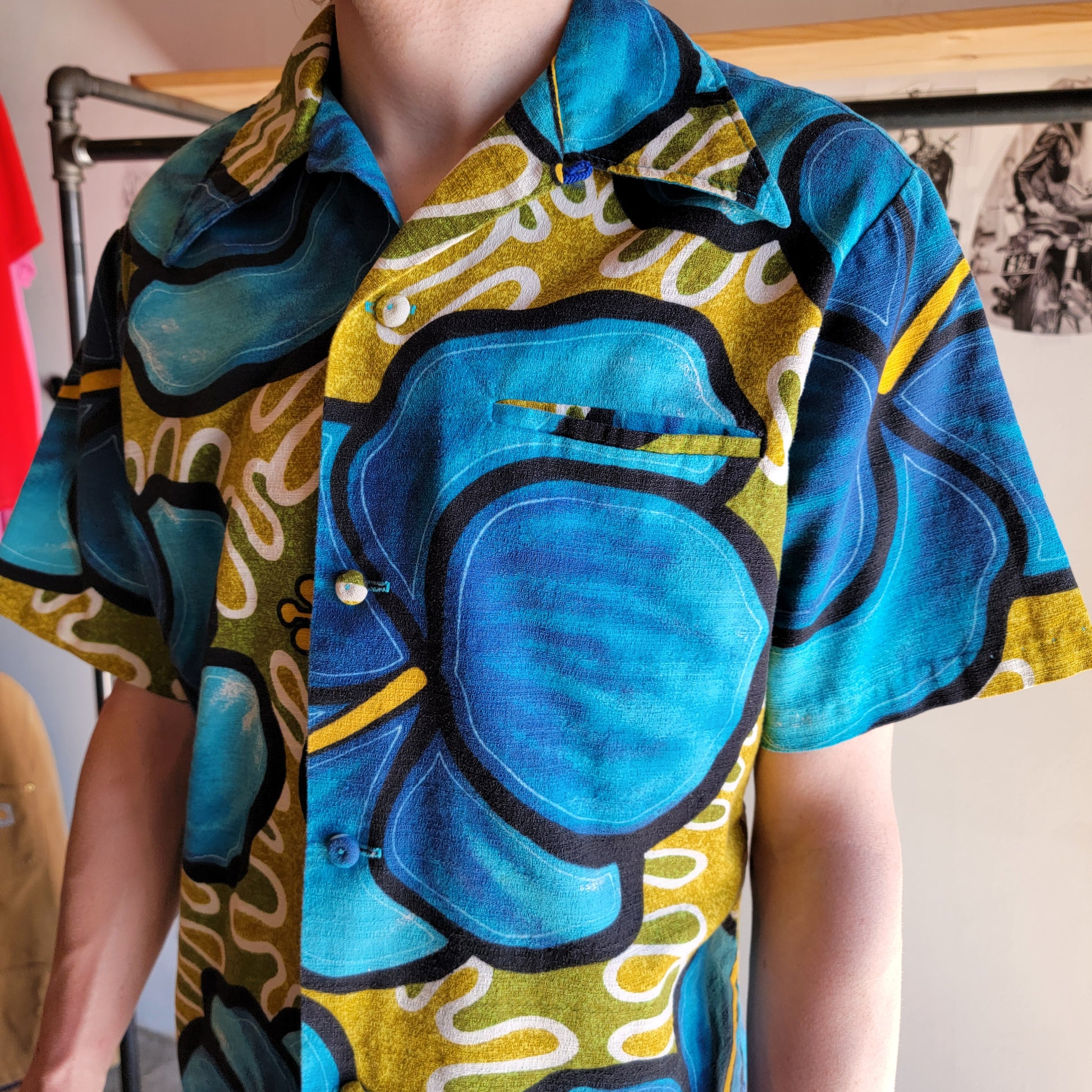 A handsome bark cloth Hawaiian shirt from the early 70s. It has a welt pocket, covered buttons, pointed collar and big oversized print. 100% cotton. Great condition. The fit is on the small side of medium.