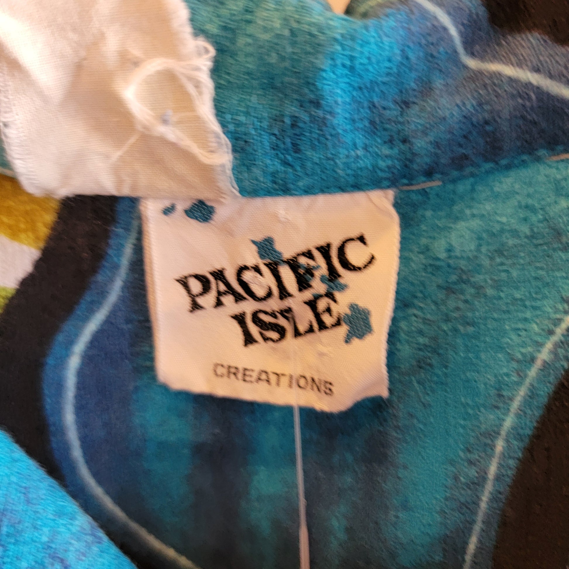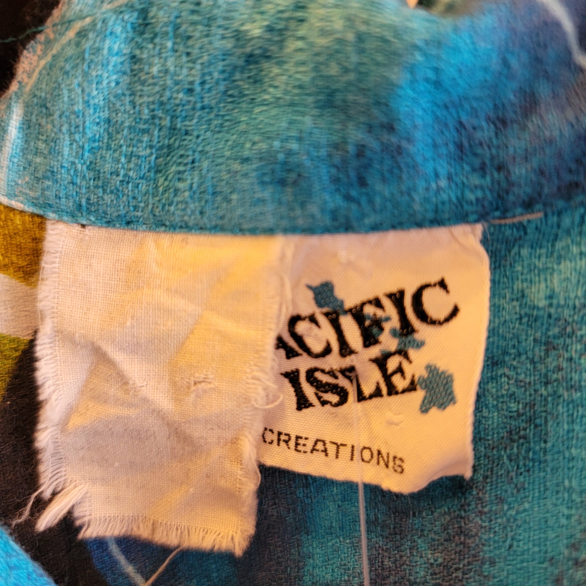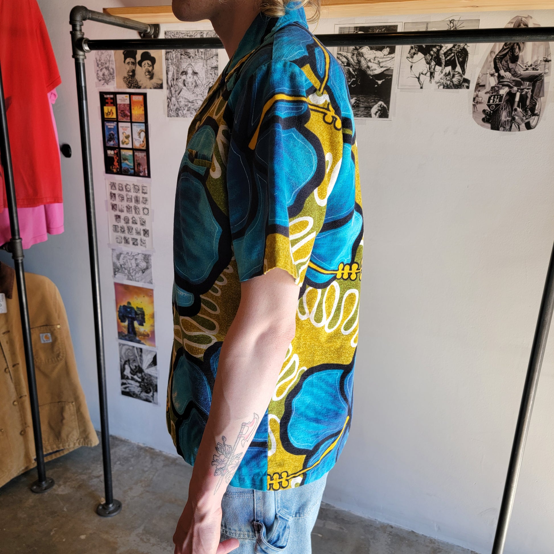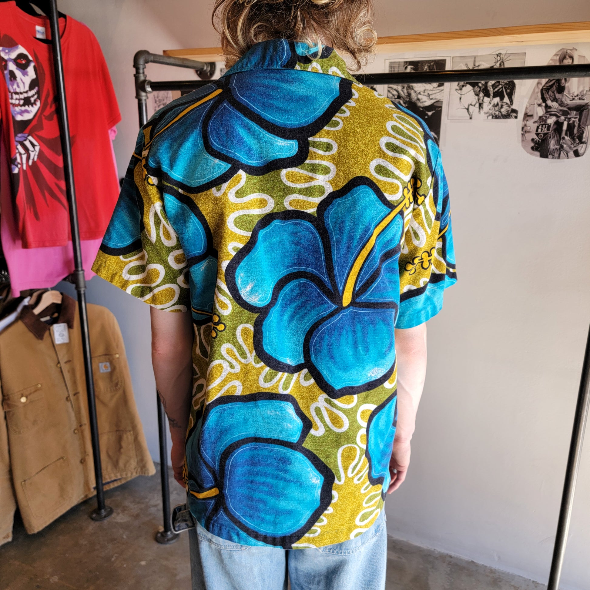 A handsome bark cloth Hawaiian shirt from the early 70s. It has a welt pocket, covered buttons, pointed collar and big oversized print. 100% cotton. Great condition. The fit is on the small side of medium.