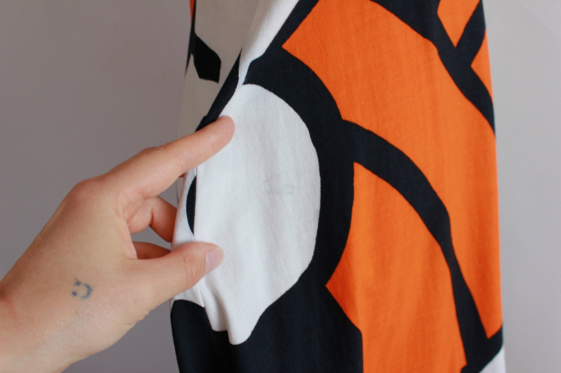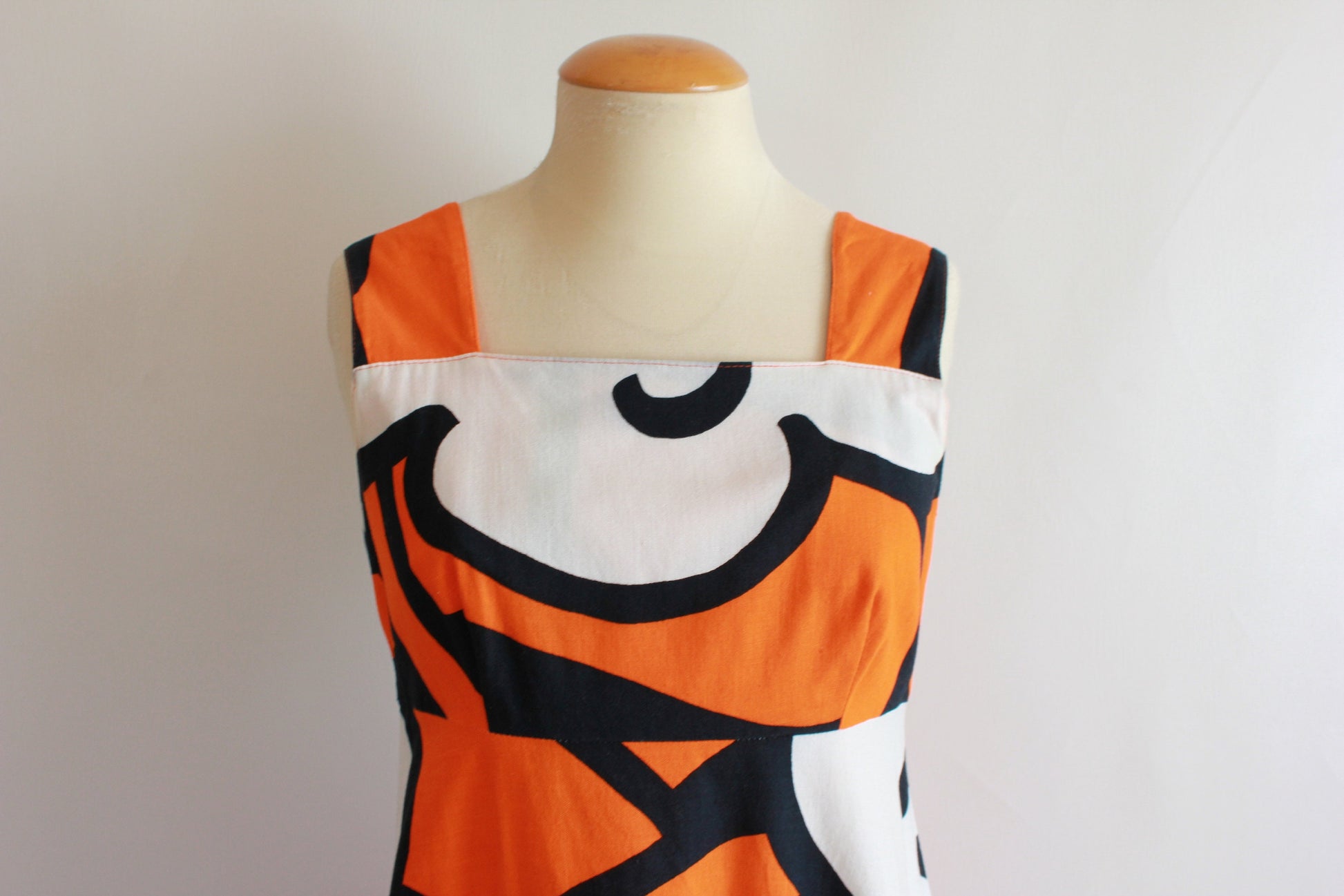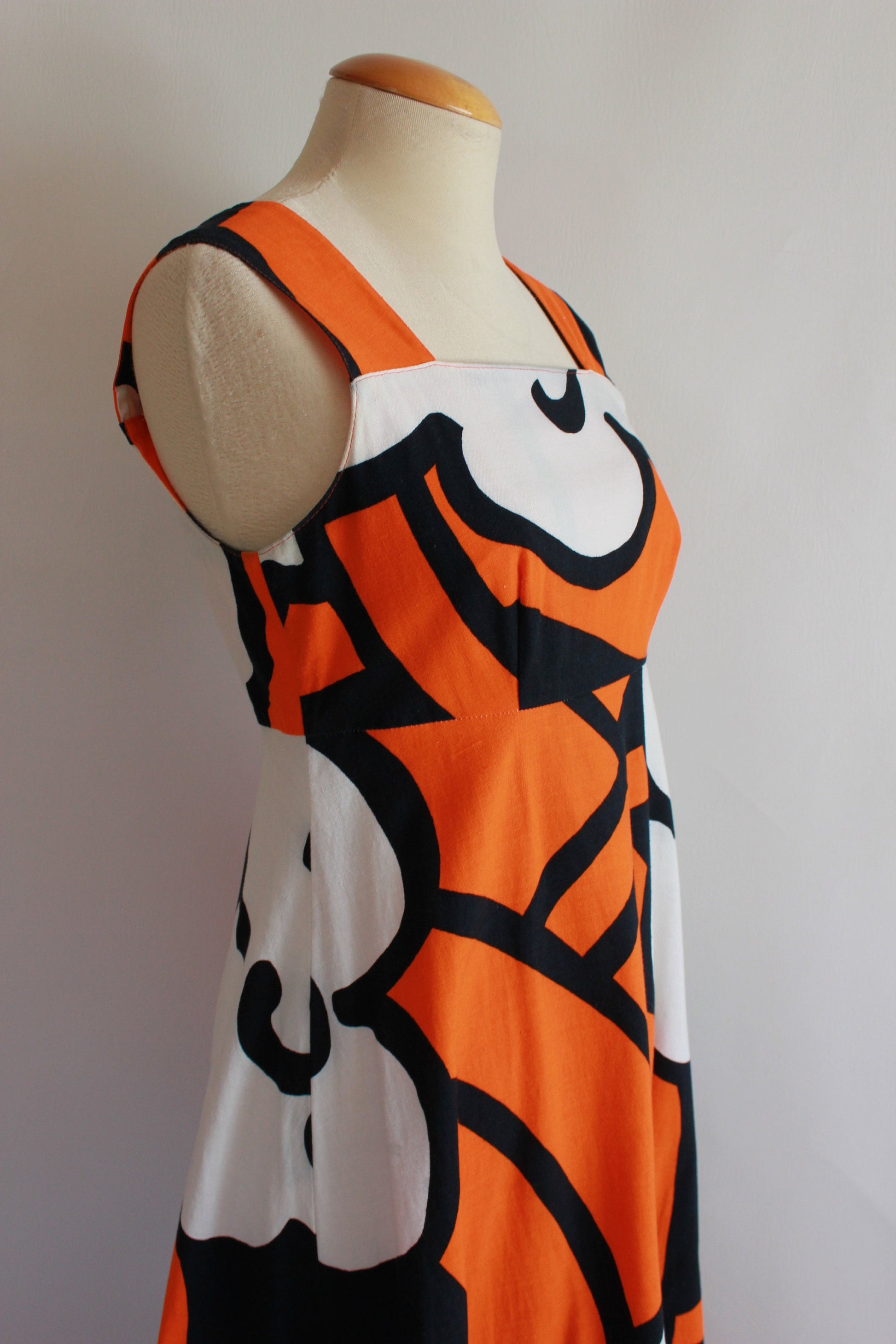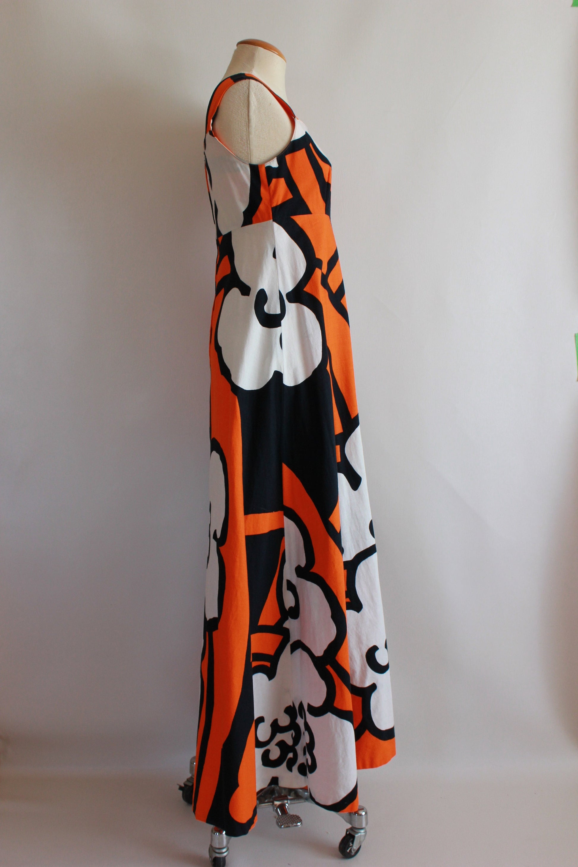 A beautiful, very rare vintage late 1960s or early 1970s large-scale floral-patterned, sleeveless maxi dress with an empire waist, wide straps and colours of orange, black and white. The dress is cotton and made in Finland by 'Merry Finn' (an early 1970s Finnish designer). The dress is unlined. Such beautiful hand-screened fabric. The dress has very minor marks (as shown) but overall the dress is in excellent condition.